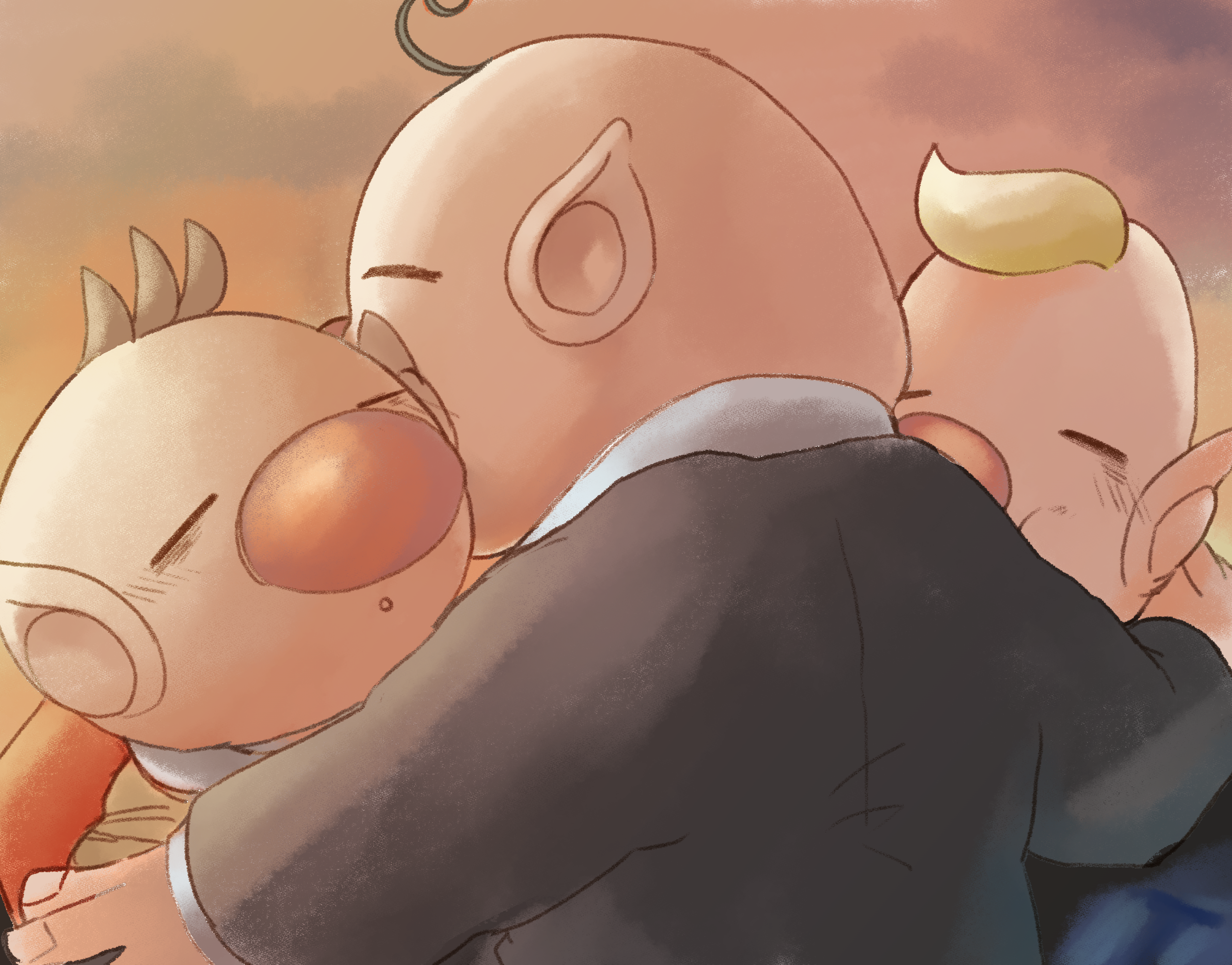 3boys absurdres backpack bag bags_under_eyes large_nose black_hair black_jacket blazer blonde_hair blue_gloves brown_hair cheek_squash closed_eyes cloud collared_shirt commentary_request cowboy_shot fingernails from_behind gloves group_hug highres hug iat-418 jacket layered_sleeves light_blush louie_(pikmin) male_focus multiple_boys nintendo missing_headwear olimar open_mouth orange_sky outdoors pikmin_(series) pointy_ears president_(pikmin) red_bag shirt short_hair sky spacesuit sunset very_short_hair white_shirt
