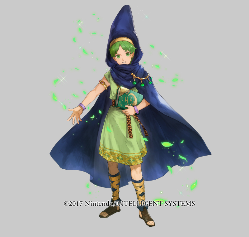 1boy belt book bracelet cape copyright_notice fire_emblem fire_emblem:_mystery_of_the_emblem fire_emblem_heroes full_body green_eyes green_hair grey_background hood jewelry leaf male_focus mayo_(becky2006) merric_(changing_winds)_(fire_emblem) merric_(fire_emblem) nintendo official_art sandals solo teeth wizard
