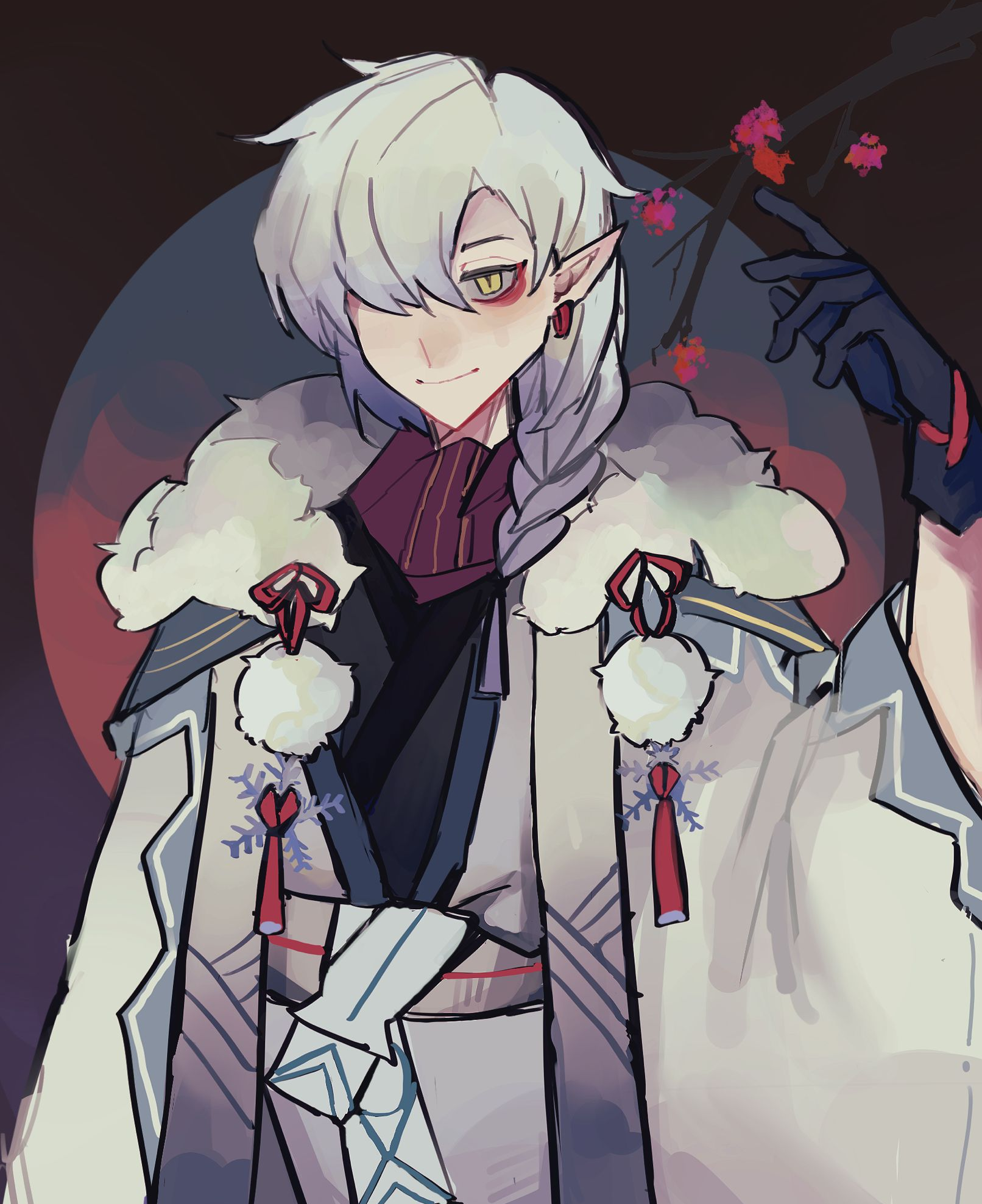 1boy black_gloves black_kimono braid closed_mouth coat earrings facepaint fur-trimmed_coat fur_trim gloves hair_over_one_eye hand_up highres ichimoku_ren_(onmyoji) japanese_clothes jewelry kimono long_hair male_focus mao_mao_lai_lou onmyoji pointy_ears side_braid single_braid slit_pupils smile solo upper_body white_coat yellow_eyes