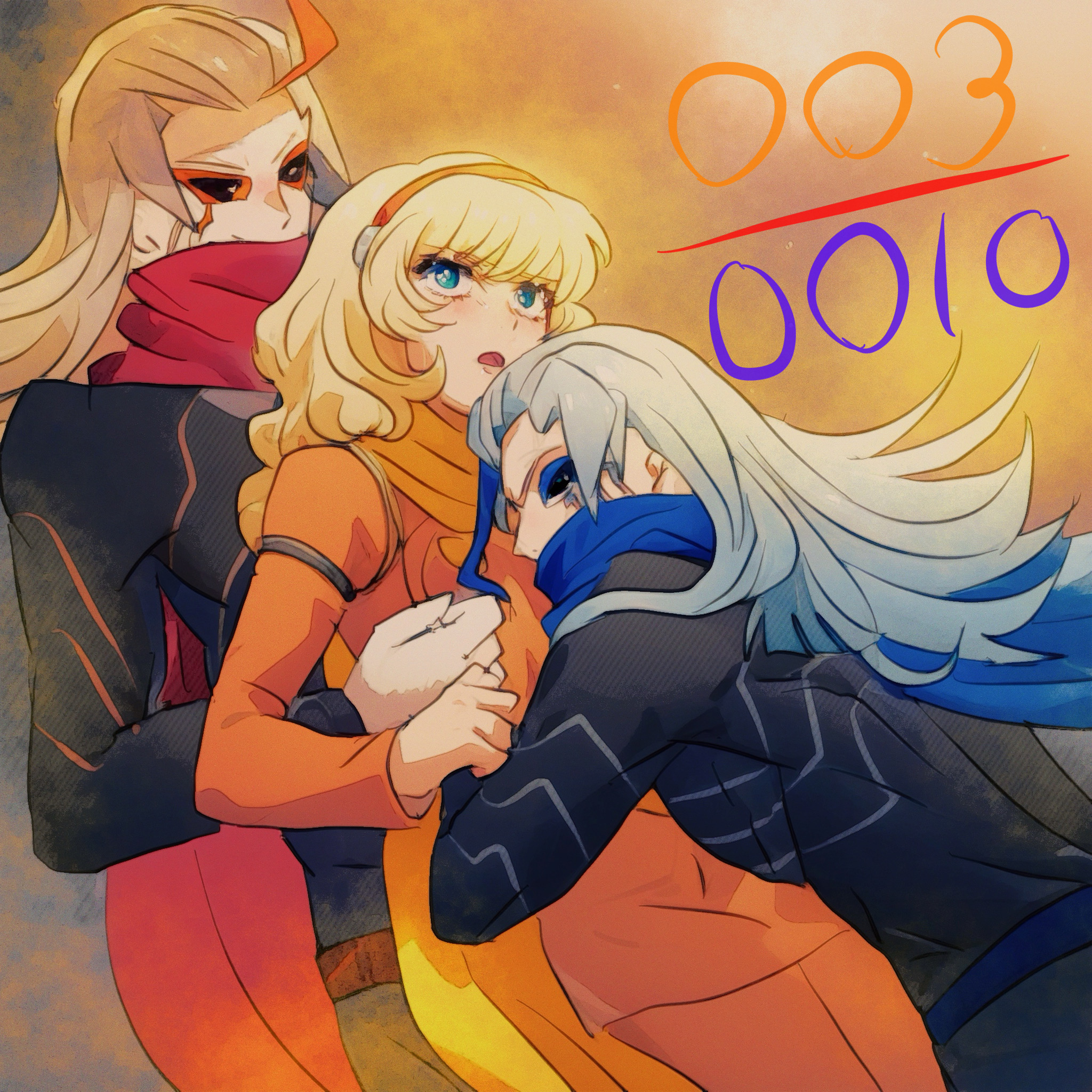 0010_(cyborg_009) 1girl 2boys black_eyes blonde_hair blue_eyes blue_scarf coat cyborg_009 francoise_arnoul hairband highres hug long_hair multicolored_hair multiple_boys red_coat red_hairband red_scarf sariokisu scarf straight_hair white_hair yellow_scarf