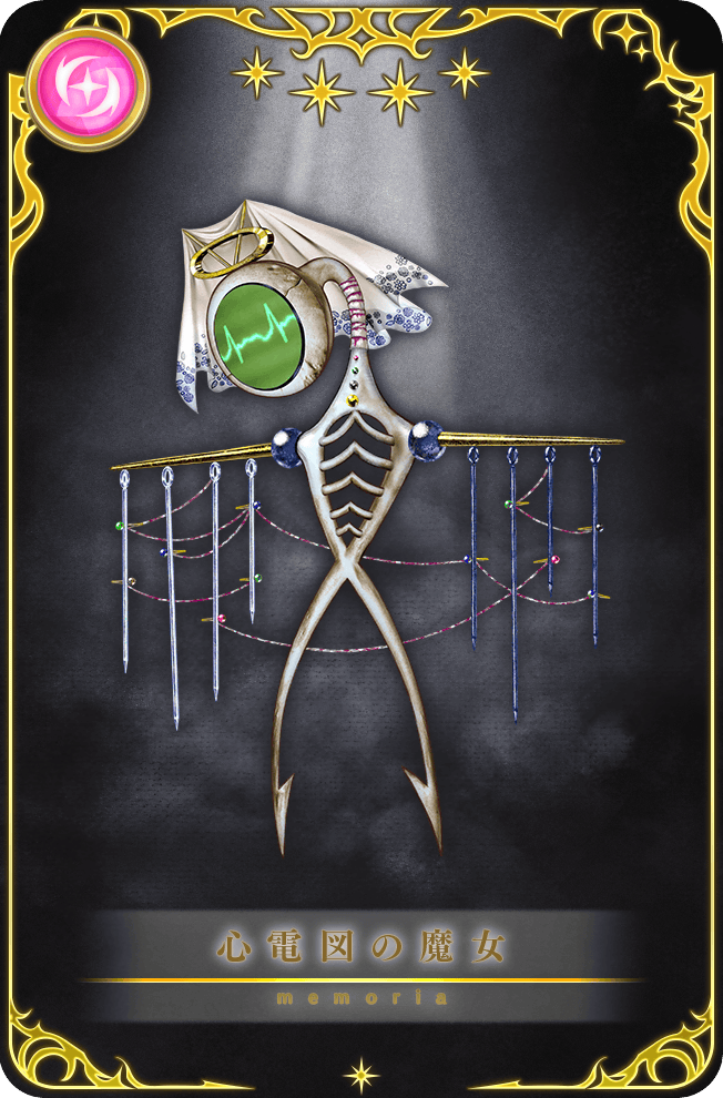 black_background card_(medium) cardiogram creature creature_focus fog game_cg gekidan_inu_curry halo magia_record:_mahou_shoujo_madoka_magica_gaiden mahou_shoujo_madoka_magica no_humans official_art picture_frame renata_(madoka_magica) ribs spotlight star_(symbol) translated veil white_veil witch_(madoka_magica) yellow_halo