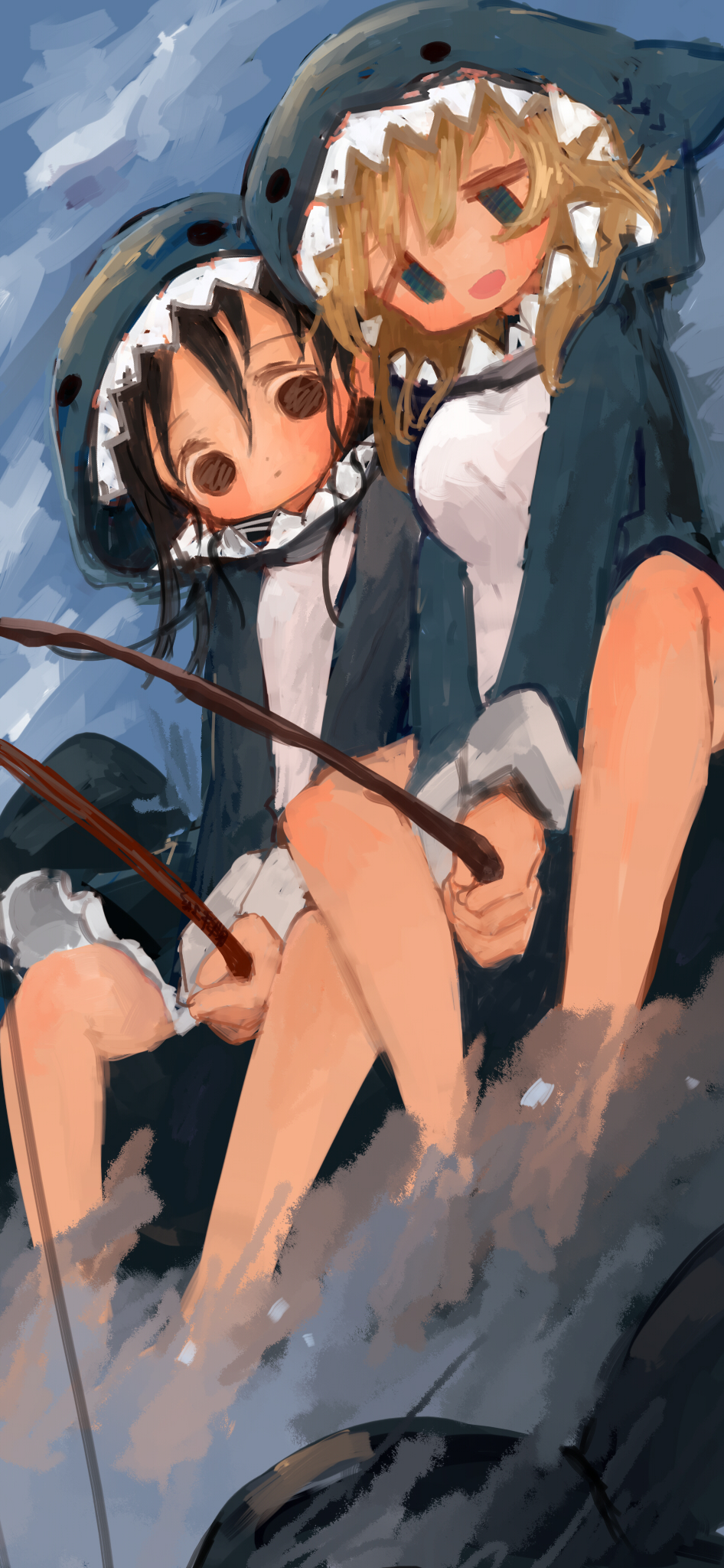 2girls alternate_costume animal_costume animal_hood bare_legs black_hair blonde_hair chito_(shoujo_shuumatsu_ryokou) fishing fishing_rod highres holding holding_fishing_rod hood hoodie kotatsu_(pchu) multiple_girls open_mouth painterly partially_submerged shark_costume shark_hood shoujo_shuumatsu_ryokou soaking_feet water yuuri_(shoujo_shuumatsu_ryokou)