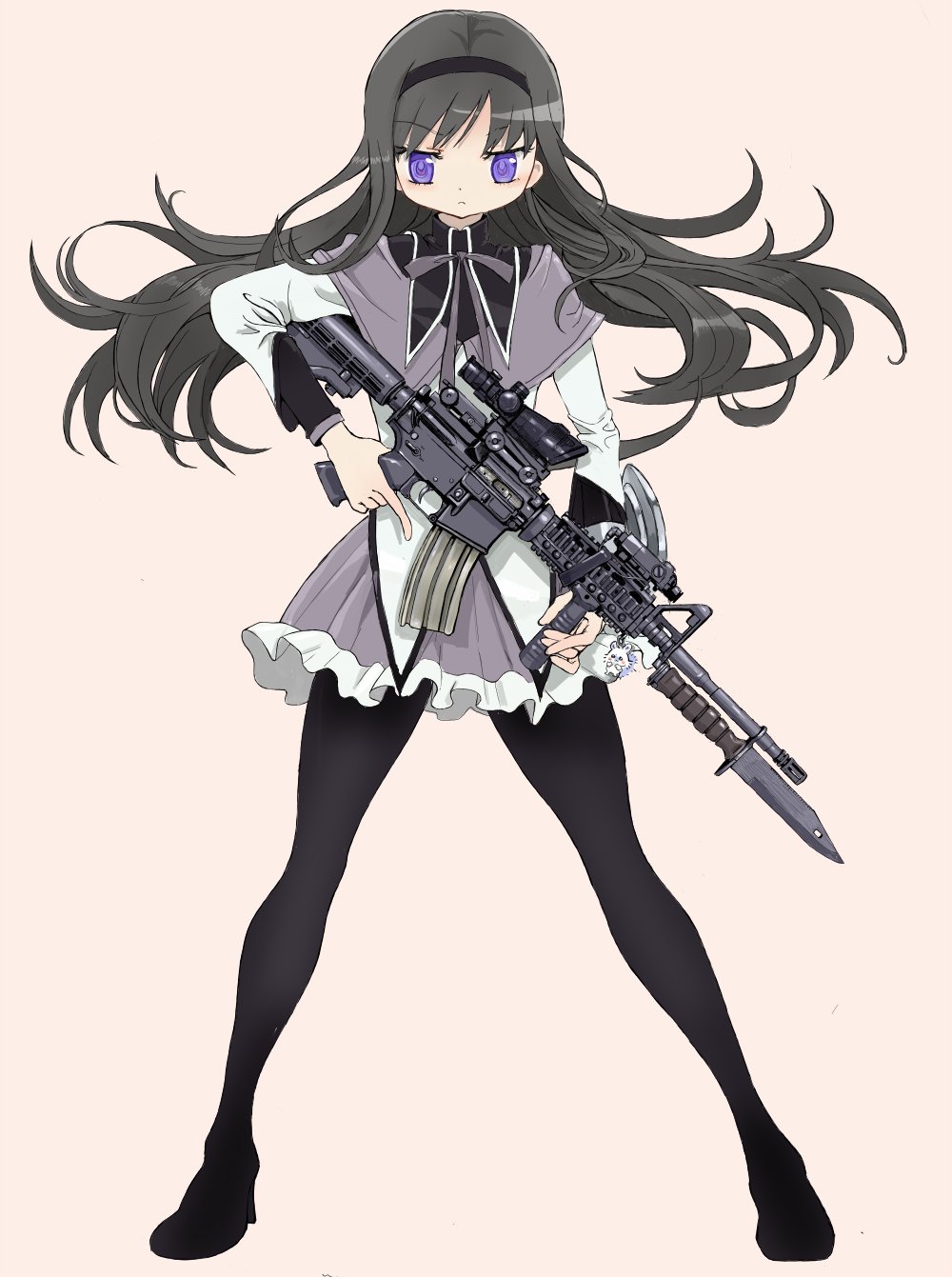 1girl akemi_homura akemi_homura_(magical_girl) assault_rifle bayonet black_hair full_body gun highres holding holding_gun holding_weapon long_hair looking_at_viewer m4_carbine magical_girl mahou_shoujo_madoka_magica pink_background purple_eyes rifle solo toshi_(little-fluffy-cloud) weapon