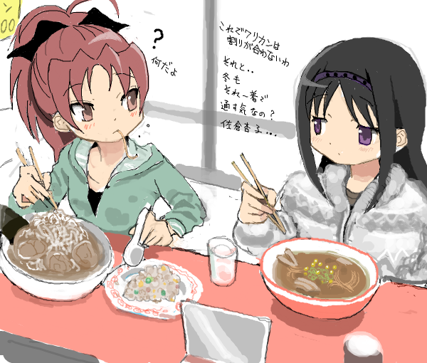 2girls ? akemi_homura black_hair bowl chopsticks food holding holding_chopsticks holding_spoon looking_at_another mahou_shoujo_madoka_magica multiple_girls noodles purple_eyes red_hair sakura_kyoko soup spoon toshi_(little-fluffy-cloud)
