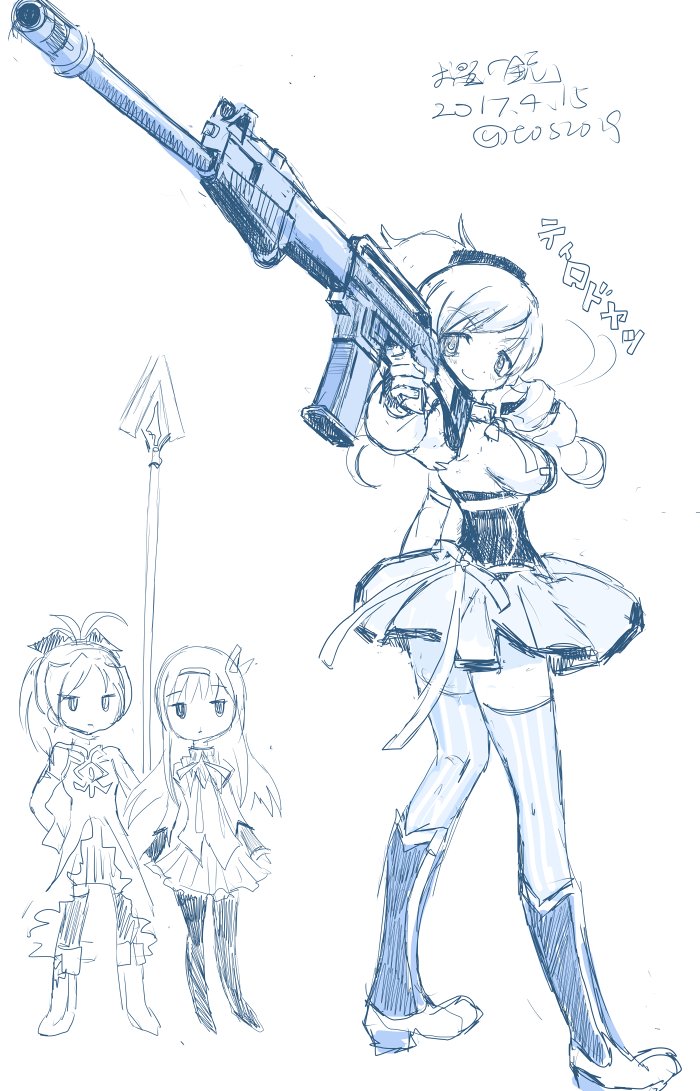 2017 3girls akemi_homura akemi_homura_(magical_girl) assault_rifle dated drill_hair full_body gun long_hair mahou_shoujo_madoka_magica monochrome multiple_girls polearm rifle sakura_kyoko sakura_kyoko_(magical_girl) spear tomoe_mami tomoe_mami_(magical_girl) toshi_(little-fluffy-cloud) twin_drills weapon white_background