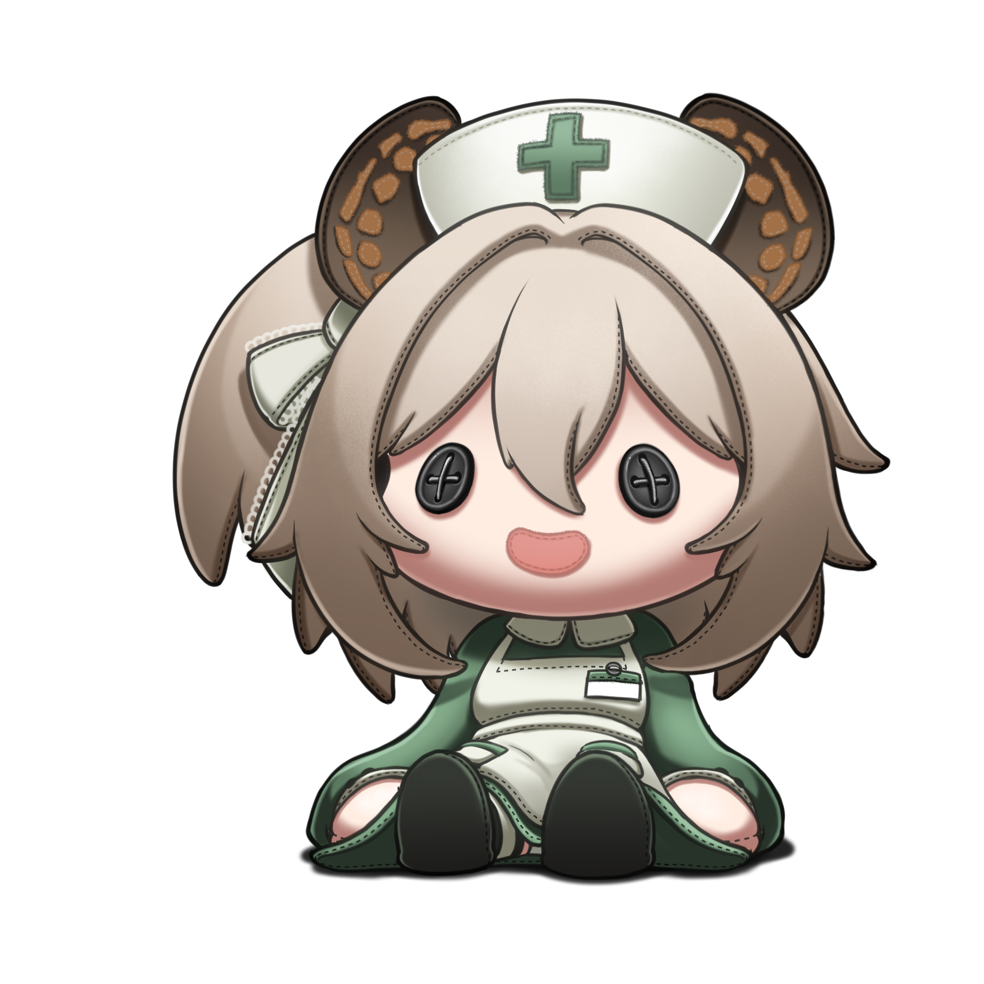 1girl animal_ears apron bow button_eyes buttons character_doll clero_(viprimo) collar doll dress green_dress grey_hair hair_bow hat highres indie_virtual_youtuber long_sleeves name_tag nimi_nightmare nimi_nightmare_(1st_costume) nurse_cap open_mouth shoes sitting solo tapir_ears tapir_girl transparent_background virtual_youtuber white_apron white_bow white_collar