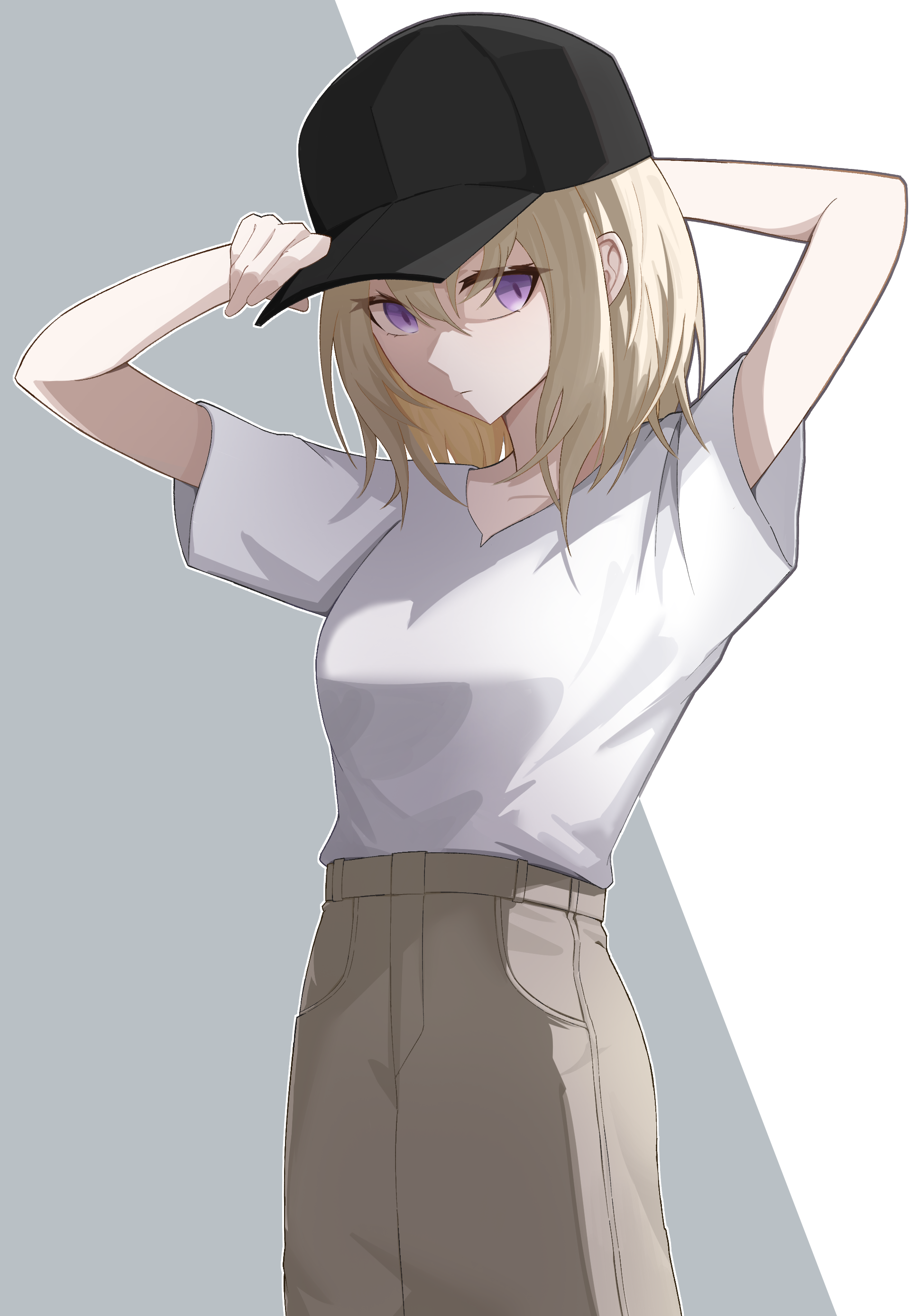 1girl absurdres adjusting_clothes adjusting_headwear bang_dream! bang_dream!_it's_mygo!!!!! baseball_cap black_hat blonde_hair brown_skirt chinese_commentary closed_mouth commentary_request hair_between_eyes hat highres inkbone medium_hair misumi_uika purple_eyes shirt short_sleeves skirt solo white_shirt