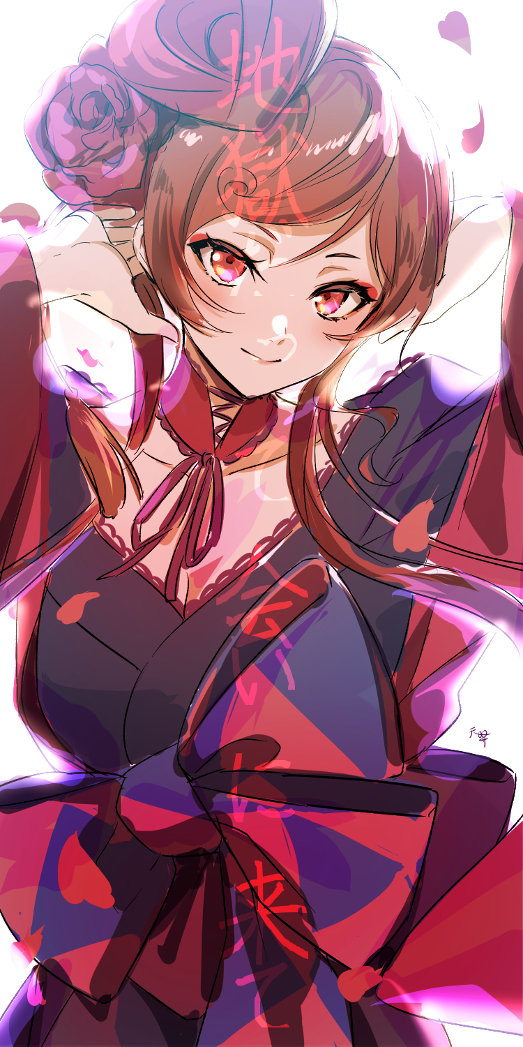 1girl black_kimono brown_hair choker closed_mouth collarbone floating_hair flower hair_flower hair_ornament highres japanese_clothes kimono long_hair looking_at_viewer red_choker red_eyes red_flower red_ribbon ribbon sketch smile solo tenni_noboru yuugiri_(zombie_land_saga) zombie_land_saga