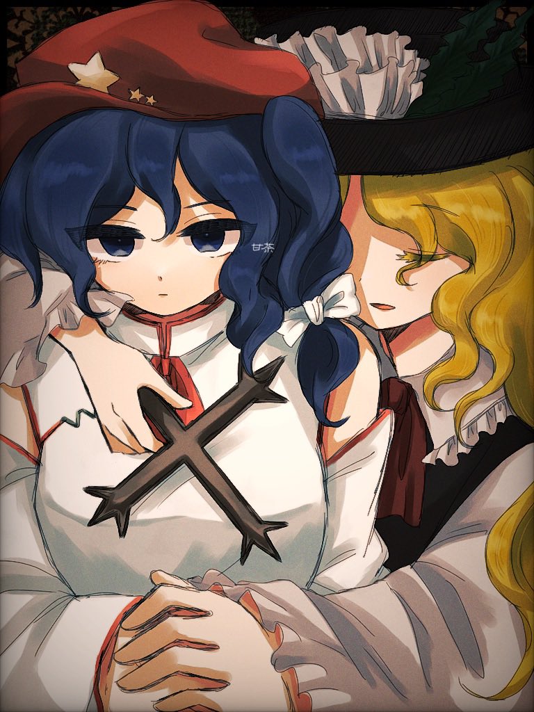 2girls amacha_0000 black_hat black_vest blonde_hair blue_eyes blue_hair commentary_request detached_sleeves dolls_in_pseudo_paradise flat_cap hat hat_ornament hug jacket_girl_(dipp) label_girl_(dipp) long_sleeves mandarin_collar medium_hair multiple_girls neck_ribbon red_hat red_ribbon ribbon shirt side_ponytail star_(symbol) star_hat_ornament touhou vest white_shirt wide_sleeves