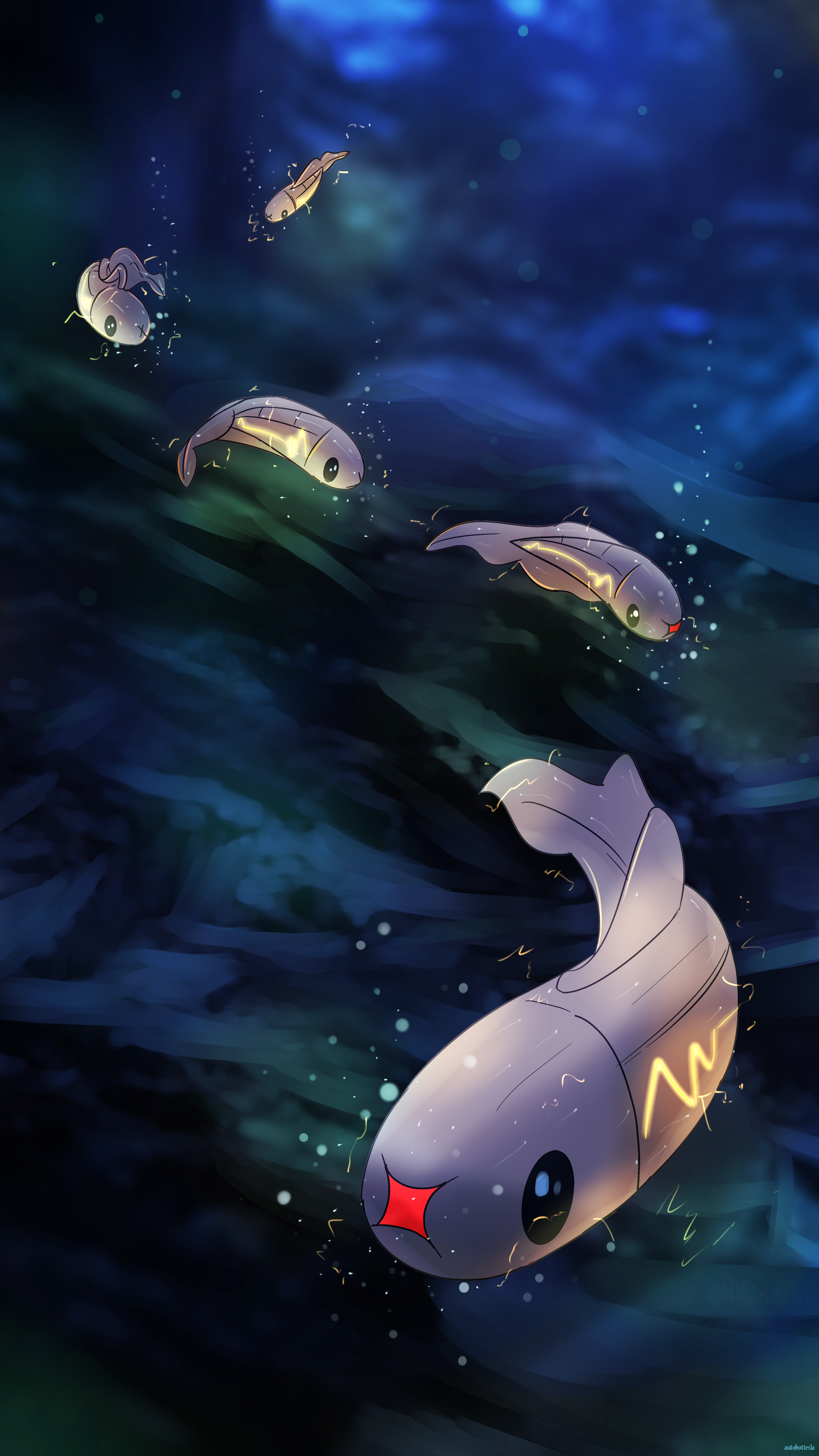 absurdres air_bubble animal_focus autobottesla bubble commentary electricity english_commentary full_body gen_5_pokemon highres nintendo no_humans open_mouth painttool_sai_(medium) pokemon pokemon_(creature) pokemon_focus swimming tynamo underwater