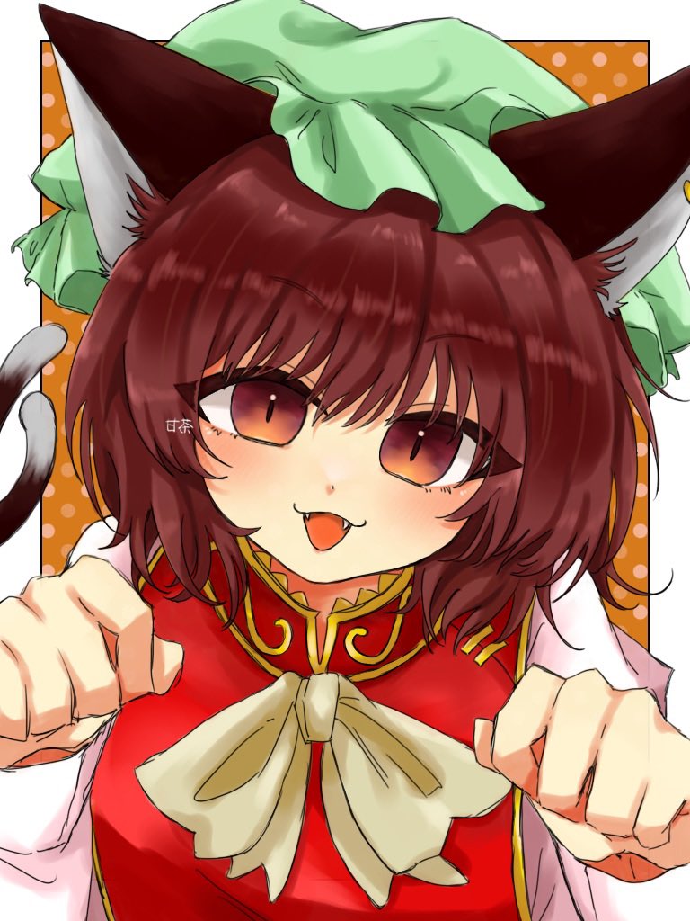 1girl :d amacha_0000 animal_ear_piercing blush border brown_eyes brown_hair cat_tail chen earrings eyes_visible_through_hair fangs frills gold_trim hair_between_eyes hat jewelry looking_at_viewer mob_cap multiple_tails nekomata open_mouth outside_border paw_pose polka_dot polka_dot_background red_vest short_hair simple_background single_earring smile solo tail touhou two_tails upper_body vest white_border