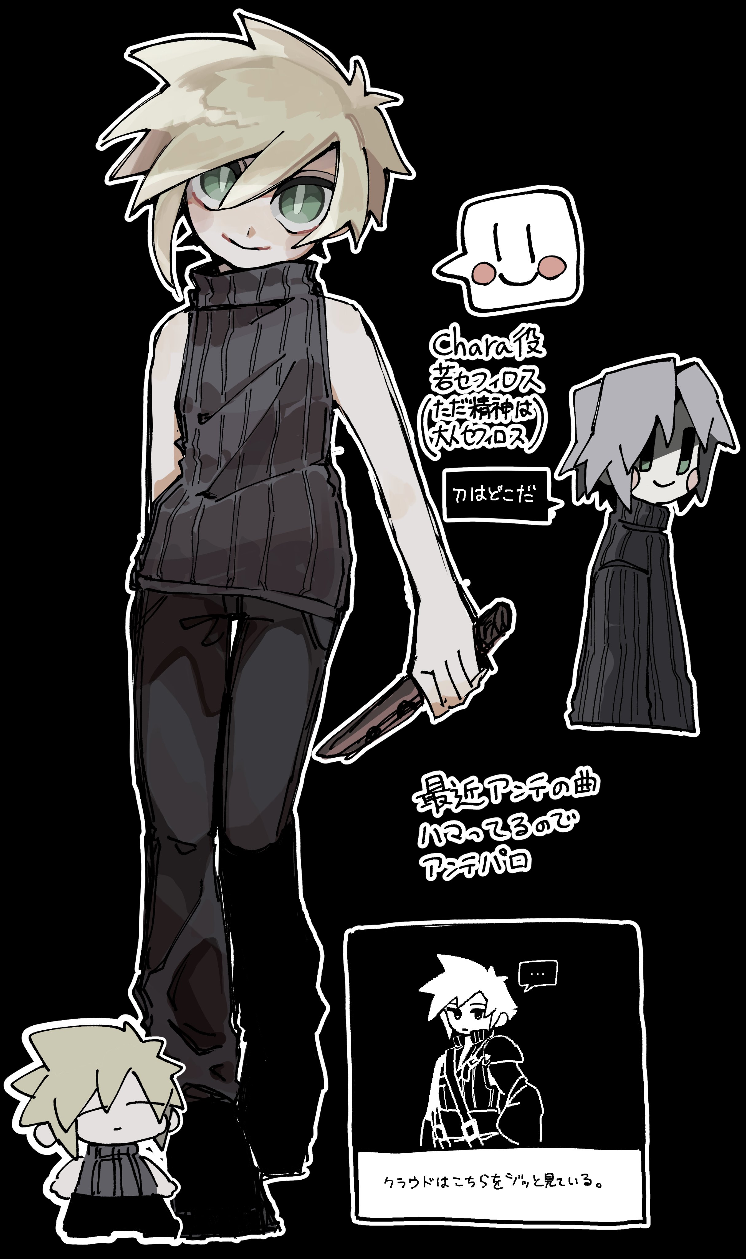 2boys absurdres blonde_hair blush_stickers bright_pupils chara_(undertale) chibi chibi_inset cloud_strife final_fantasy final_fantasy_vii final_fantasy_vii:_advent_children gameplay_mechanics green_eyes grey_hair highres holding holding_weapon kawa_2929_ff male_focus multiple_boys sephiroth sephiroth_(ever_crisis) short_hair sleeveless sleeveless_turtleneck slit_pupils smile speech_bubble spiked_hair translation_request turtleneck undertale utdr_(toby_fox) weapon white_pupils