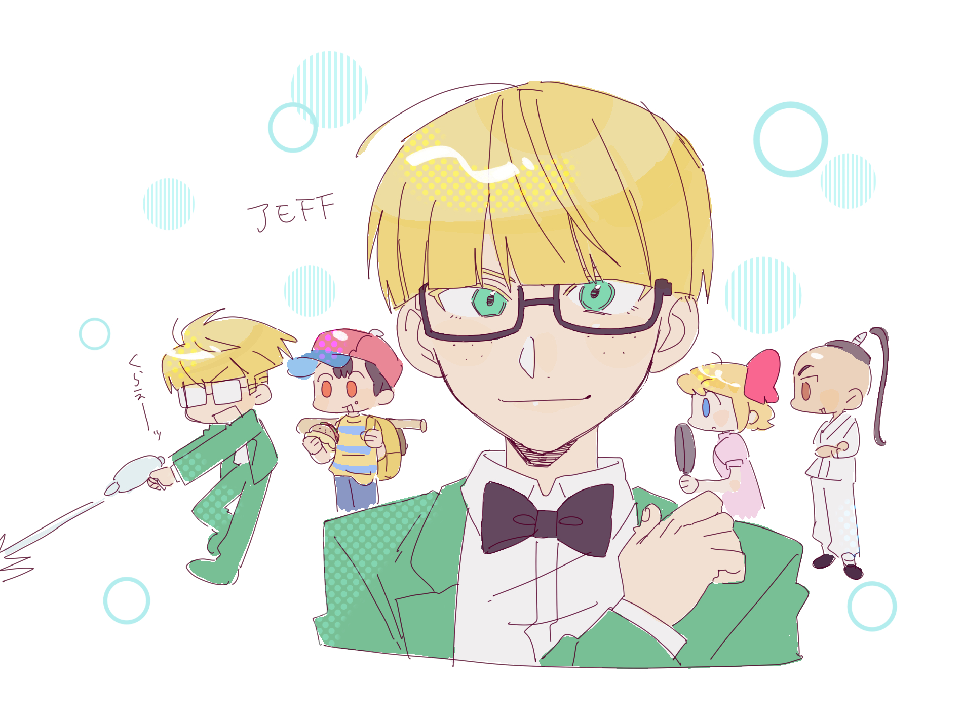 1girl 3boys baseball_cap black_hair blonde_hair bow cyappy1022 dress glasses hair_bow hat highres jeff_andonuts mother_(series) mother_2 multiple_boys ness_(mother_2) nintendo pants paula_(mother_2) pink_dress poo_(mother_2) shirt short_hair shorts striped_clothes striped_shirt