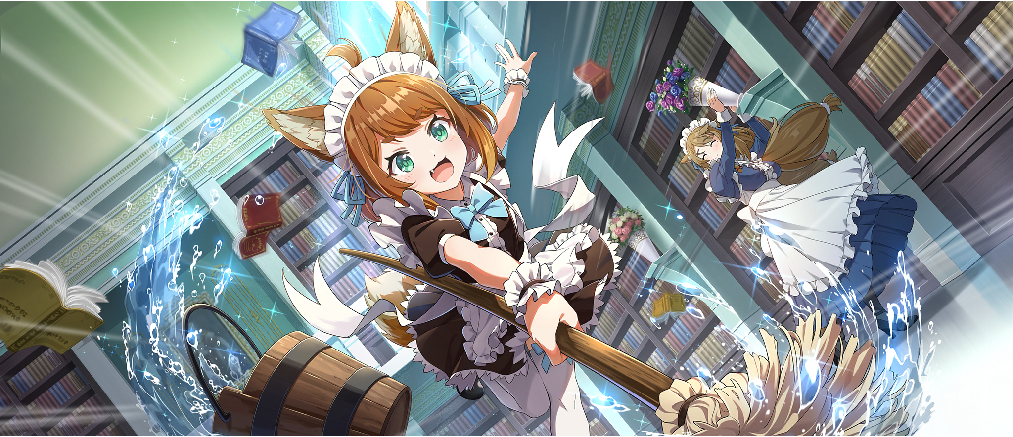 2girls :3 \||/ ahoge alternate_costume amy_(konosuba) animal_ear_fluff animal_ears apron blue_bow blue_bowtie book bookshelf bow bowtie braid braided_sidelock breasts brown_hair bucket child cleaning closed_eyes closed_mouth droopy_ears enmaided fang flower frills from_below game_cg green_eyes hair_between_eyes high_heels highres holding holding_mop holding_vase indoors juliet_sleeves kono_subarashii_sekai_ni_shukufuku_wo! konosuba!_fantastic_days large_breasts library long_hair long_sleeves low_twintails maid maid_apron maid_headdress matching_outfits medium_hair miia_(konosuba) mole mole_under_eye mop multiple_girls official_alternate_costume official_art open_mouth outstretched_arms puffy_short_sleeves puffy_sleeves short_sleeves sidelocks smile standing strappy_heels swept_bangs tail thighhighs twintails vase very_long_hair water white_apron white_thighhighs wooden_bucket wrist_cuffs