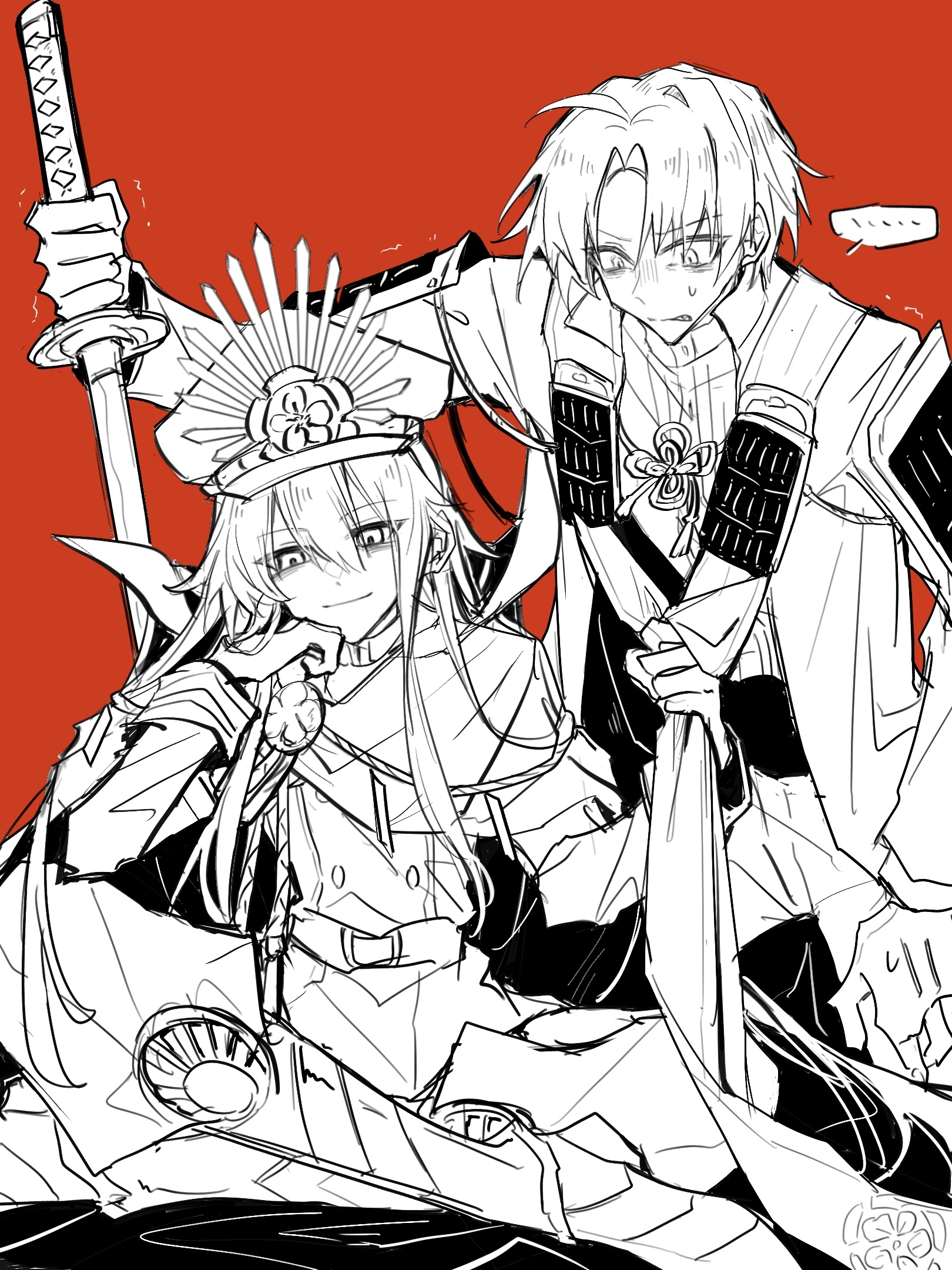 ... 1boy 1girl ahoge belt cape chinese_commentary clenched_teeth closed_mouth commentary_request constricted_pupils crossover curtained_hair fate/grand_order fate_(series) flower_knot greyscale_with_colored_background hair_between_eyes hat heshikiri_hasebe highres holding holding_sword holding_weapon katana long_hair long_sleeves oda_nobunaga_(fate) oda_nobunaga_(koha-ace) parted_bangs red_background short_hair simple_background sitting smile speech_bubble spoken_ellipsis sweat sword teeth touken_ranbu trembling weapon yuezhuanlang