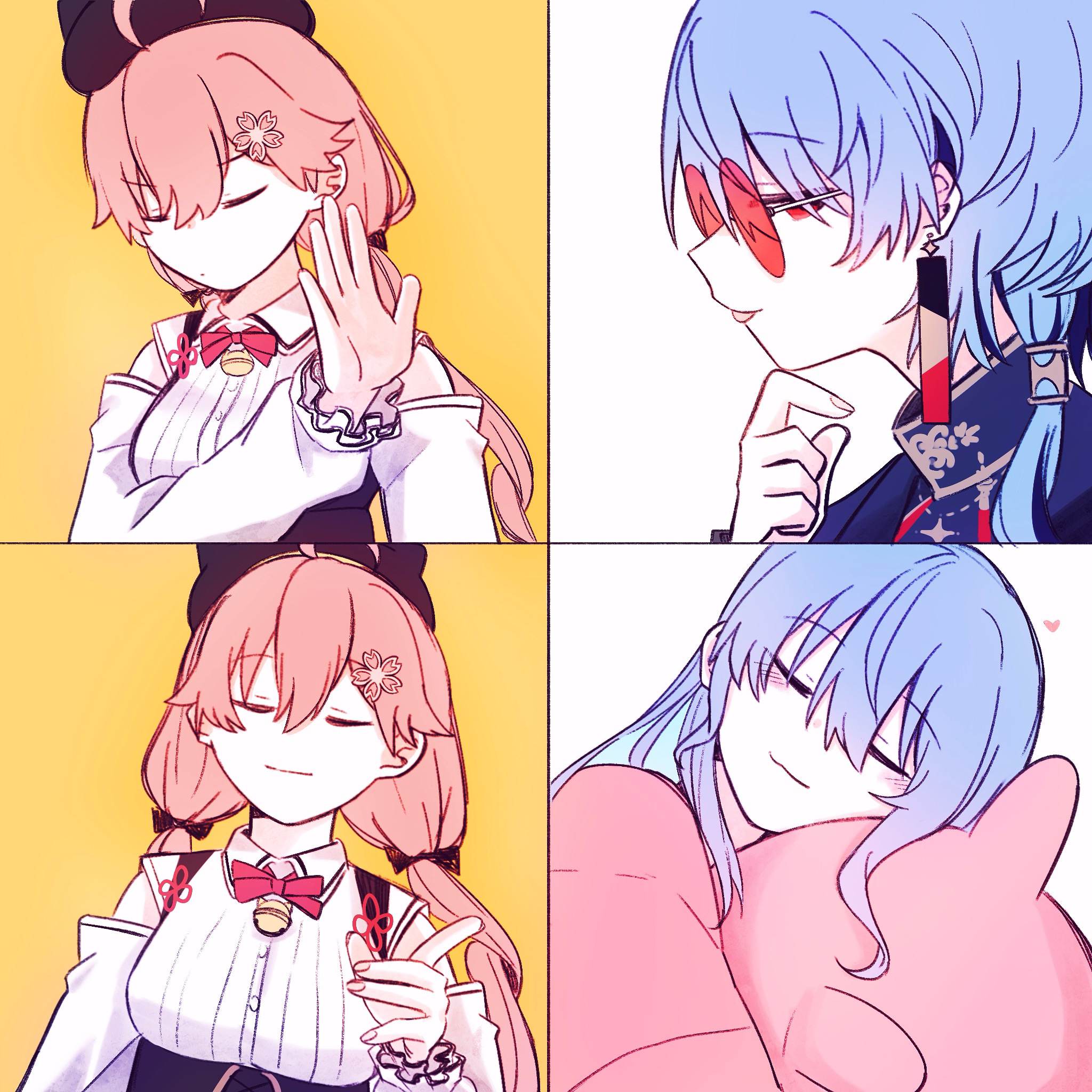 2girls bell blue_hair blush closed_eyes closed_mouth clothing_cutout commentary earrings hand_up heart highres hololive hoshimachi_suisei hoshimachi_suisei_(oriental_suit) index_finger_raised jewelry long_hair long_sleeves multiple_girls neck_bell pink_hair red-tinted_eyewear red_eyes sakura_miko sakura_miko_(casual) shirt shoulder_cutout sleeping smile sunglasses tinted_eyewear tongue tongue_out two-tone_background virtual_youtuber white_background white_shirt yellow_background yumi5469