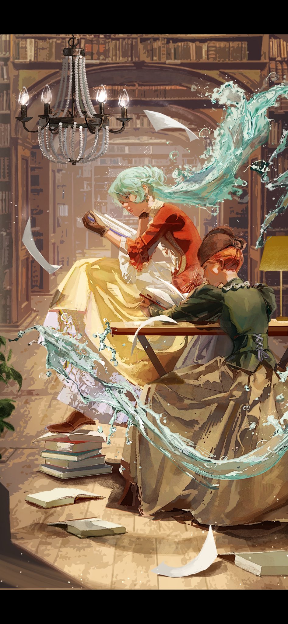2girls aqua_hair blurry blurry_background book bookshelf bow breasts brown_gloves brown_hat brown_skirt chandelier closed_mouth commentary desk_lamp dress earrings english_commentary frilled_skirt frilled_sleeves frills gloves green_shirt half-dress hat highres hydrokinesis jewelry lamp library light_particles long_hair looking_at_object multiple_girls orange_hair original parted_lips plant puffy_sleeves reading red_dress shirt sitting skirt small_breasts striped_bow water wooden_floor yellow_skirt zhishangjun123