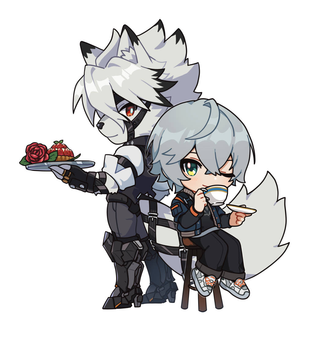 2boys belt black_belt black_gloves black_hair black_pants black_shirt black_vest blue_jacket closed_mouth commentary crossed_bangs cup double-parted_bangs fingerless_gloves flower furry furry_male gloves green_eyes grey_hair hair_between_eyes hashtag-only_commentary holding holding_cup holding_plate jacket layered_sleeves long_sleeves looking_at_another male_focus multiple_boys ne1192z10a on_stool one_eye_closed pants plate red_eyes red_flower red_rose rose shirt shoes short_over_long_sleeves short_sleeves simple_background sitting sleeve_cuffs smile sneakers standing stool tail_belt teacup vest von_lycaon white_background white_hair white_shirt wise_(zenless_zone_zero) zenless_zone_zero