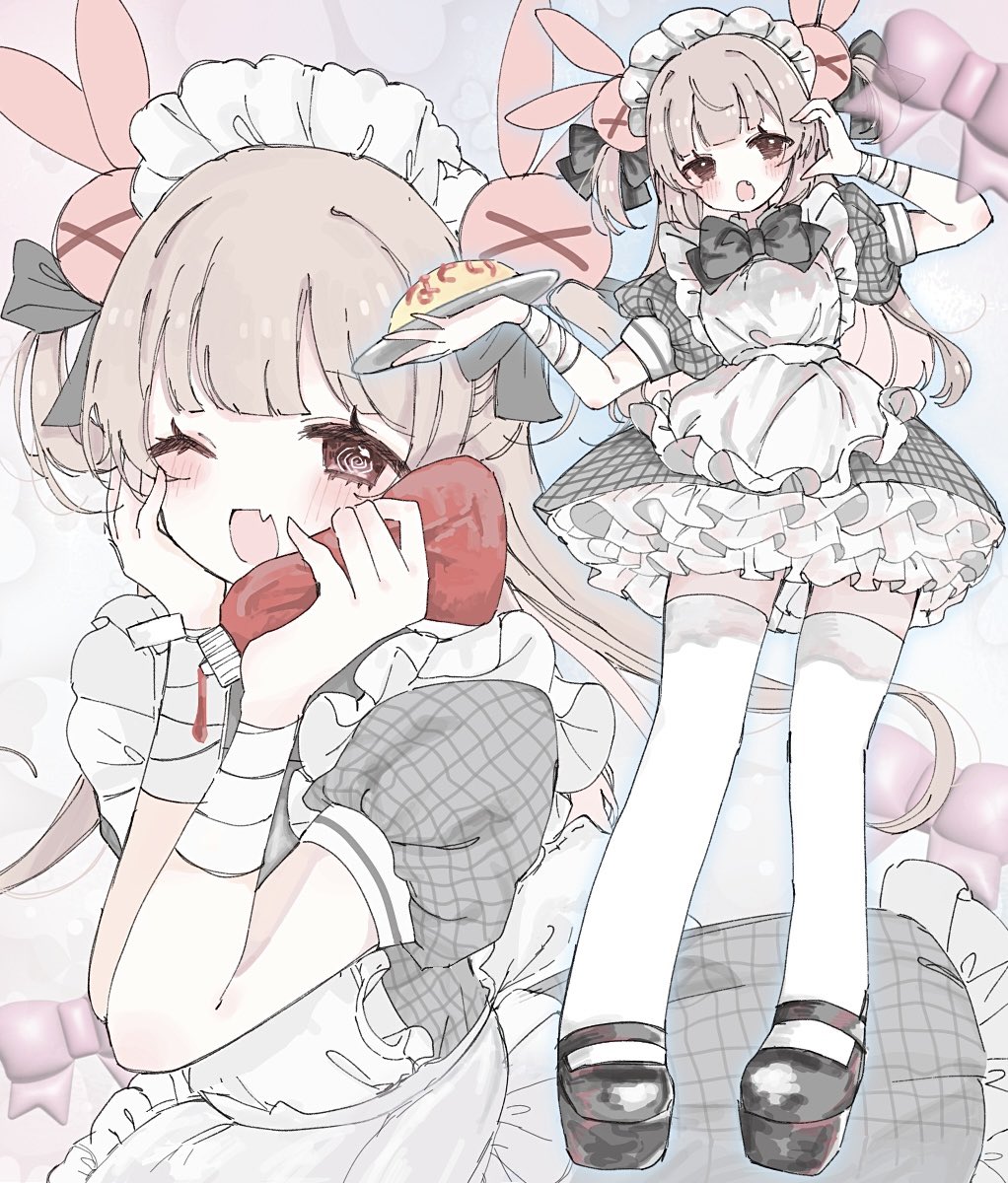 1girl apron bottle brown_hair commentary dress food frilled_apron frills full_body grey_dress hair_ornament hands_on_own_cheeks hands_on_own_face hands_up highres holding holding_bottle holding_plate ketchup_bottle long_hair looking_at_viewer maid maid_headdress mary_janes moimoiyuyu multiple_views natori_sana omelet omurice one_eye_closed open_mouth petticoat plaid_clothes plaid_dress plate puffy_short_sleeves puffy_sleeves rabbit_hair_ornament sana_channel shoes short_sleeves smile untranslatable_commentary thighhighs two_side_up virtual_youtuber white_apron white_thighhighs