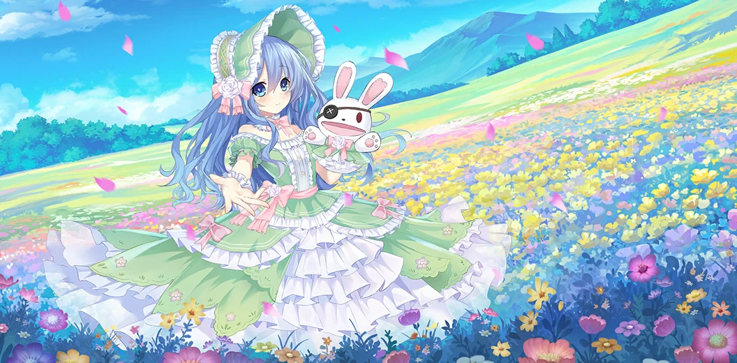 1girl alternate_costume blue_eyes blue_hair blue_sky cloud date_a_live date_a_live:_spirit_pledge dress dutch_angle eyepatch falling_petals field flower flower_field frilled_dress frills game_cg green_dress hair_between_eyes hand_puppet hime_lolita himekawa_yoshino lolita_fashion long_hair looking_at_viewer mountainous_horizon official_alternate_costume official_art outdoors outstretched_arm petals puppet sky smile solo third-party_source yoshinon