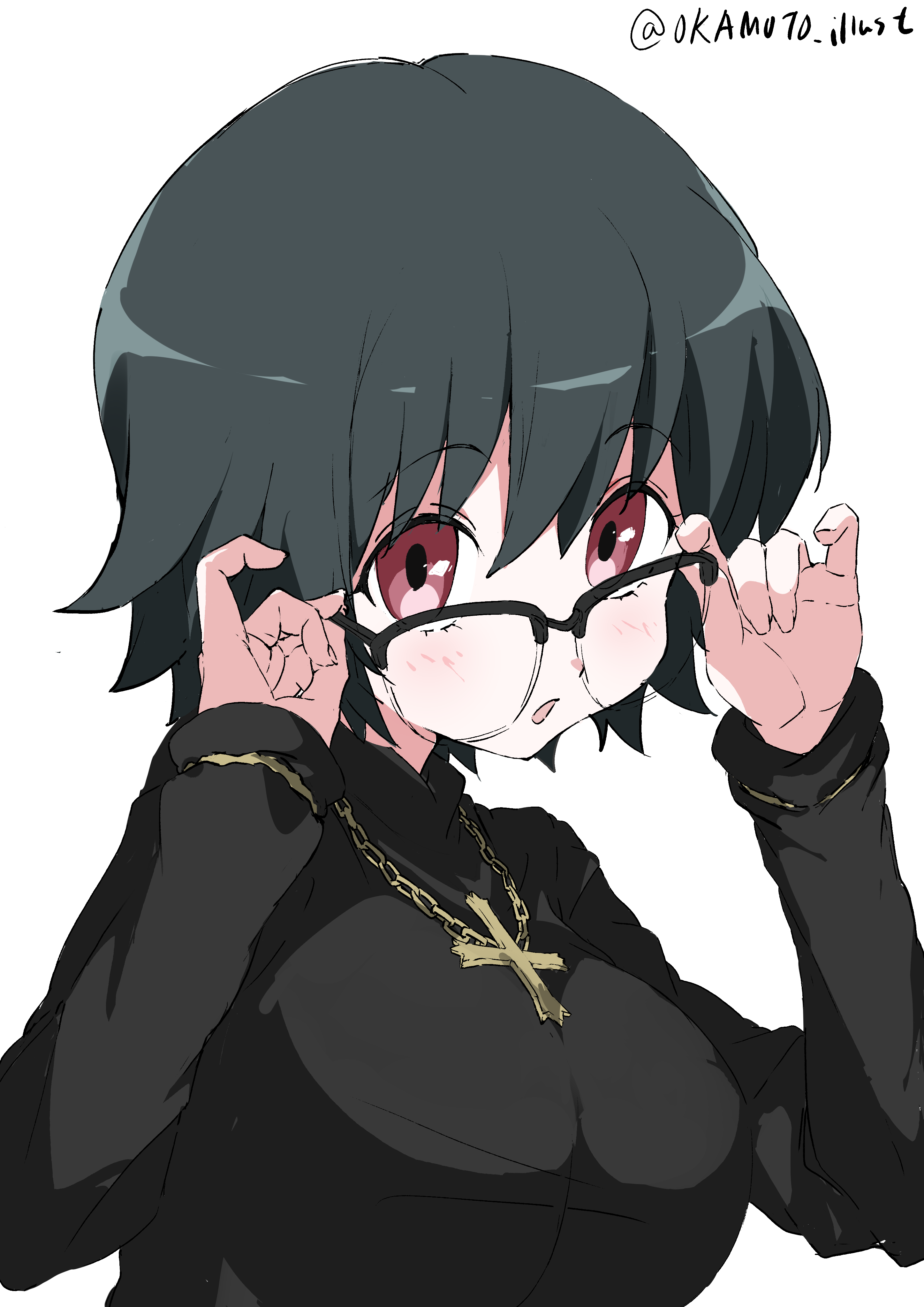 1girl :o absurdres adjusting_eyewear black-framed_eyewear black_hair black_sweater blush breasts cross_necklace eyelashes glasses hair_between_eyes highres hunter_x_hunter inverted_cross inverted_cross_necklace jewelry looking_at_viewer necklace over-rim_eyewear red_eyes semi-rimless_eyewear shizuku_murasaki short_hair simple_background solo sweater swept_bangs turtleneck turtleneck_sweater upper_body white_background white_gorilla_(okamoto)