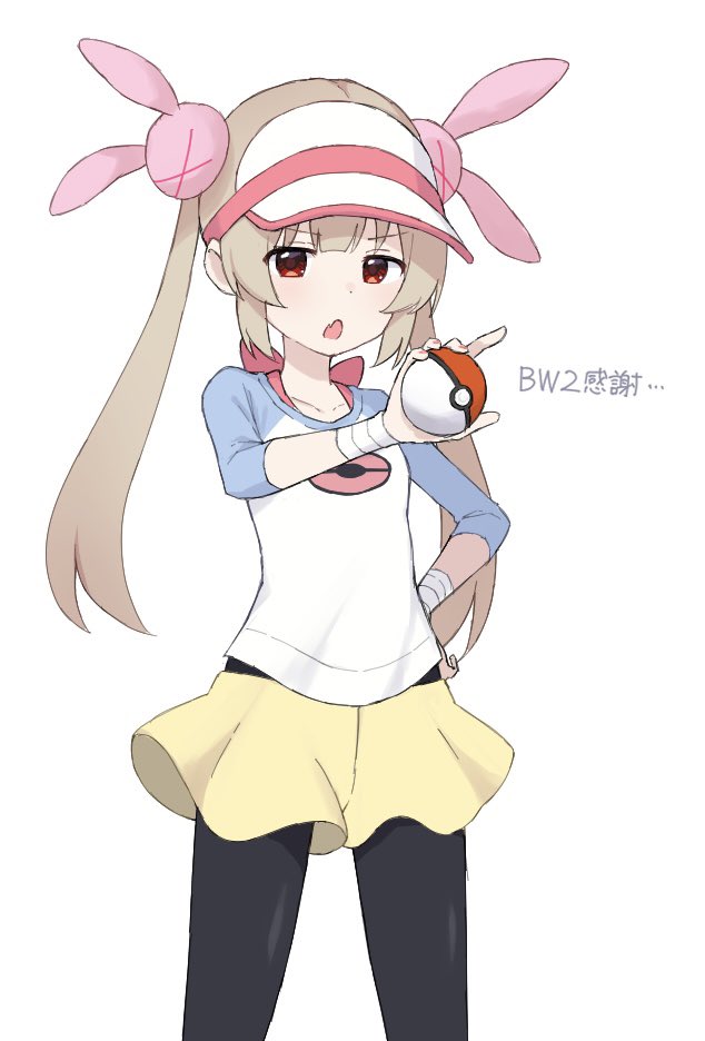 1girl black_pantyhose cosplay cowboy_shot hair_ornament hand_on_own_hip hand_up holding holding_poke_ball long_hair looking_at_viewer natori_sana nintendo open_mouth pantyhose poke_ball poke_ball_(basic) poke_ball_print pokemon pokemon_black_2_and_white_2 rabbit_hair_ornament raglan_sleeves red_eyes rosa_(pokemon) rosa_(pokemon)_(cosplay) sana_channel sanz_zzz shorts simple_background solo translation_request twintails virtual_youtuber visor_cap white_background yellow_shorts