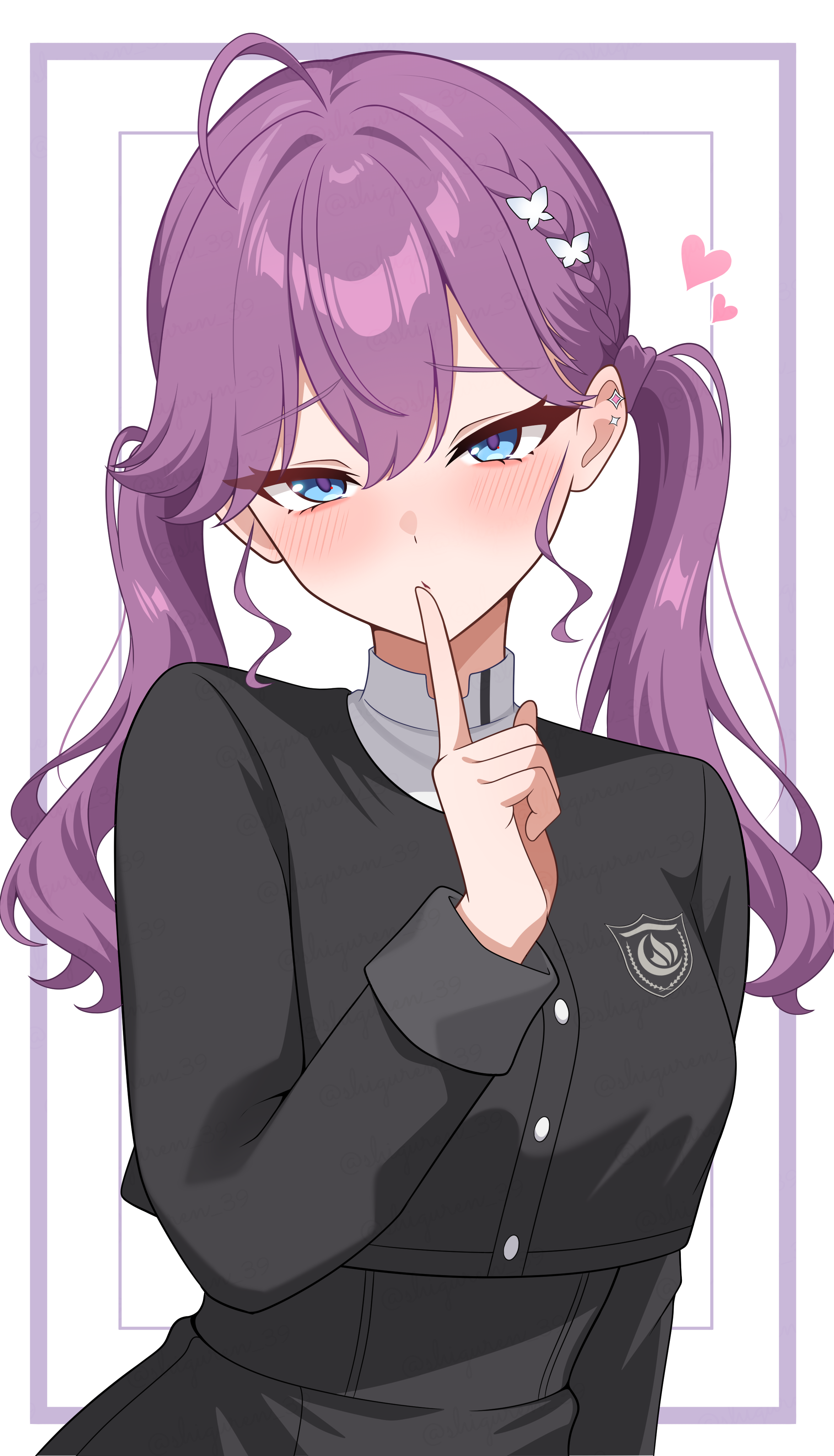 1girl absurdres ahoge black_jacket black_skirt blush braid butterfly_hair_ornament cropped_jacket finger_to_mouth gakuen_idolmaster gokugetsu_gakuen_school_uniform hair_ornament heart high-waist_skirt highres idolmaster jacket kaya_rinha long_hair long_sleeves looking_at_viewer purple_hair school_uniform shiguren_39 shirt skirt solo twintails upper_body white_shirt