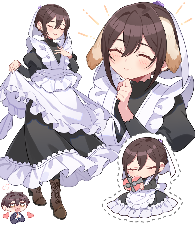 1boy 1girl ^_^ aijou_rentarou animal_ears apron black_dress blush boots box brown_boots brown_eyes brown_hair chibi chibi_inset closed_eyes closed_mouth commentary_request dog_ears double-parted_bangs dress fake_animal_ears frilled_apron frills full_body hair_between_eyes hand_on_own_chest heart heart-shaped_box heart-shaped_pupils holding juliet_sleeves kanyoko_(yuzukano_17) kimi_no_koto_ga_dai_dai_dai_dai_daisuki_na_100-nin_no_kanojo lace-up_boots long_hair long_sleeves maid maid_apron meido_mei open_mouth puffy_sleeves short_hair simple_background smile standing symbol-shaped_pupils white_apron white_background