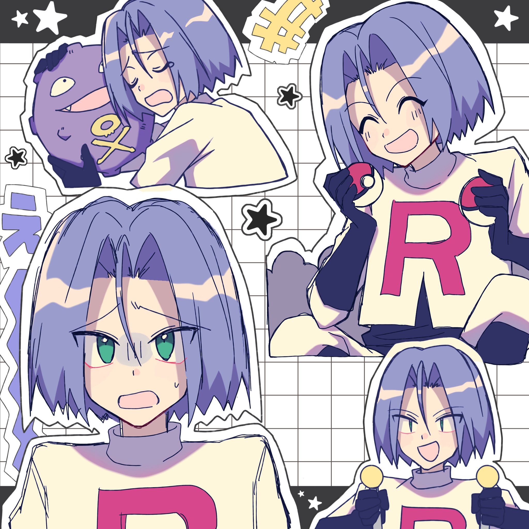 1boy closed_eyes crop_top gen_1_pokemon gloves green_eyes happy highres james_(pokemon) logo multiple_views nintendo open_mouth poke_ball poke_ball_(basic) pokemon pokemon_(anime) pokemon_(classic_anime) purple_hair sad star_(symbol) team_rocket team_rocket_uniform weezing worried yuzutan_(zvhc3728)