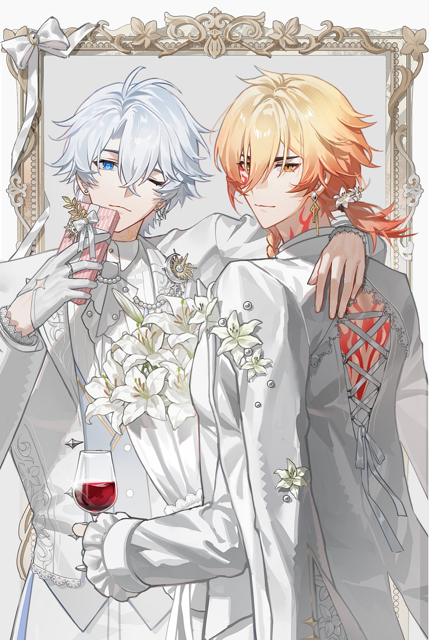 2boys antenna_hair ascot back_cutout blonde_hair blue_eyes bouquet braid brooch chinese_commentary chocolate clothing_cutout commentary_request cup drinking_glass earrings empty_picture_frame facial_tattoo flower food frilled_sleeves frills gloves gold_earrings gradient_hair hair_between_eyes half_gloves hand_on_another's_shoulder highres holding holding_bouquet holding_chocolate holding_cup holding_food honkai:_star_rail honkai_(series) jacket jacket_on_shoulders jewelry layered_sleeves long_sleeves looking_at_viewer looking_back male_focus medium_hair multicolored_hair multiple_boys mydei_(honkai:_star_rail) neck_tattoo one_eye_closed pants phainon_(honkai:_star_rail) picture_frame ponytail red_hair red_tattoo ribbon short_hair side_braid single_glove stud_earrings suirandanshihao suit_jacket tattoo vest white_ascot white_background white_flower white_gloves white_hair white_jacket white_pants white_ribbon white_vest wine_glass yellow_eyes