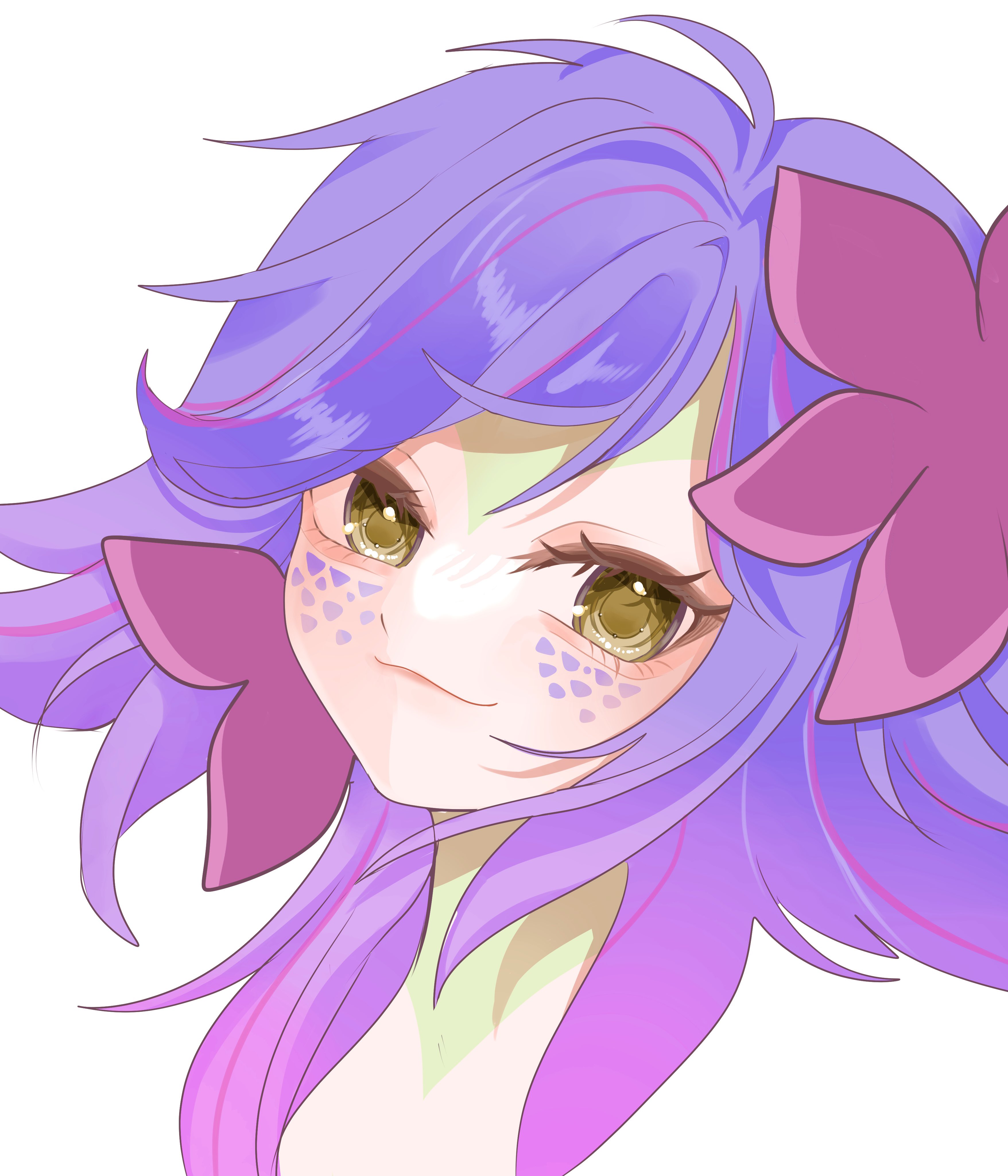 1girl absurdres blue_skin brown_eyes colored_skin cropped_head flower green_skin hair_flower hair_ornament highres league_of_legends looking_at_viewer neeko_(league_of_legends) pink_flower sanununm simple_background smile smug solo white_background