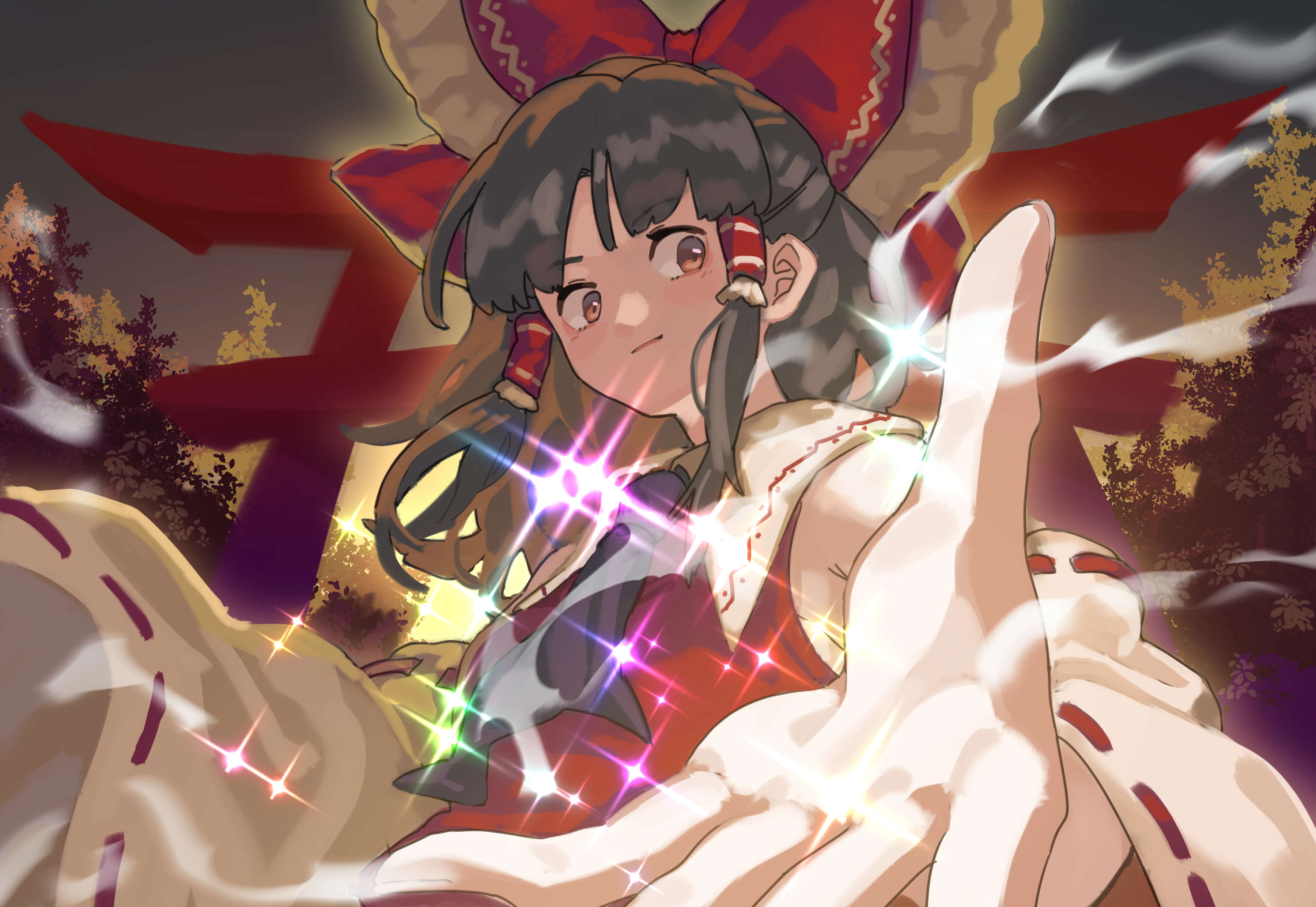1girl absurdres bow brown_eyes brown_hair closed_mouth commentary detached_sleeves frilled_bow frilled_hair_tubes frills hair_bow hair_tubes hakurei_reimu highres light_smile long_hair looking_at_viewer outdoors red_bow ribbon-trimmed_sleeves ribbon_trim smoke solo sparkle torii touhou tuck_(tuck23978434)