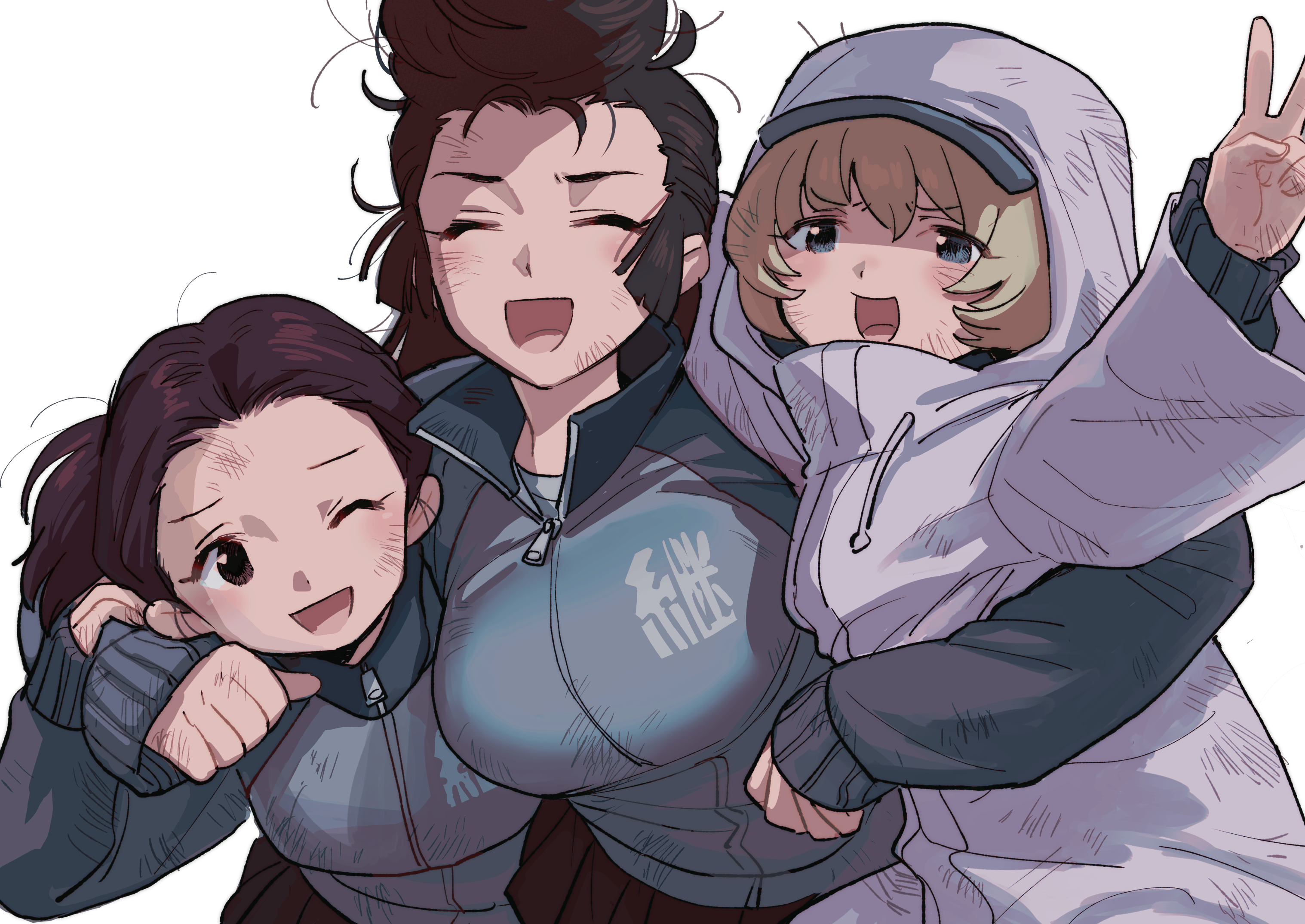 3girls arm_around_another's_back arm_around_neck baseball_cap black_hair blue_eyes blue_hat blue_jacket brown_hair closed_eyes coat commentary dirty drawstring facing_viewer girls_und_panzer grey_hair group_hug hat highres hood hood_up hooded_coat hug jacket katsuoboshi keizoku_military_uniform long_hair long_sleeves looking_at_viewer military_uniform multiple_girls one_eye_closed one_side_up pompadour raglan_sleeves short_hair simple_background tami_(girls_und_panzer) track_jacket v white_background white_coat youko_(girls_und_panzer) yuri_(girls_und_panzer)