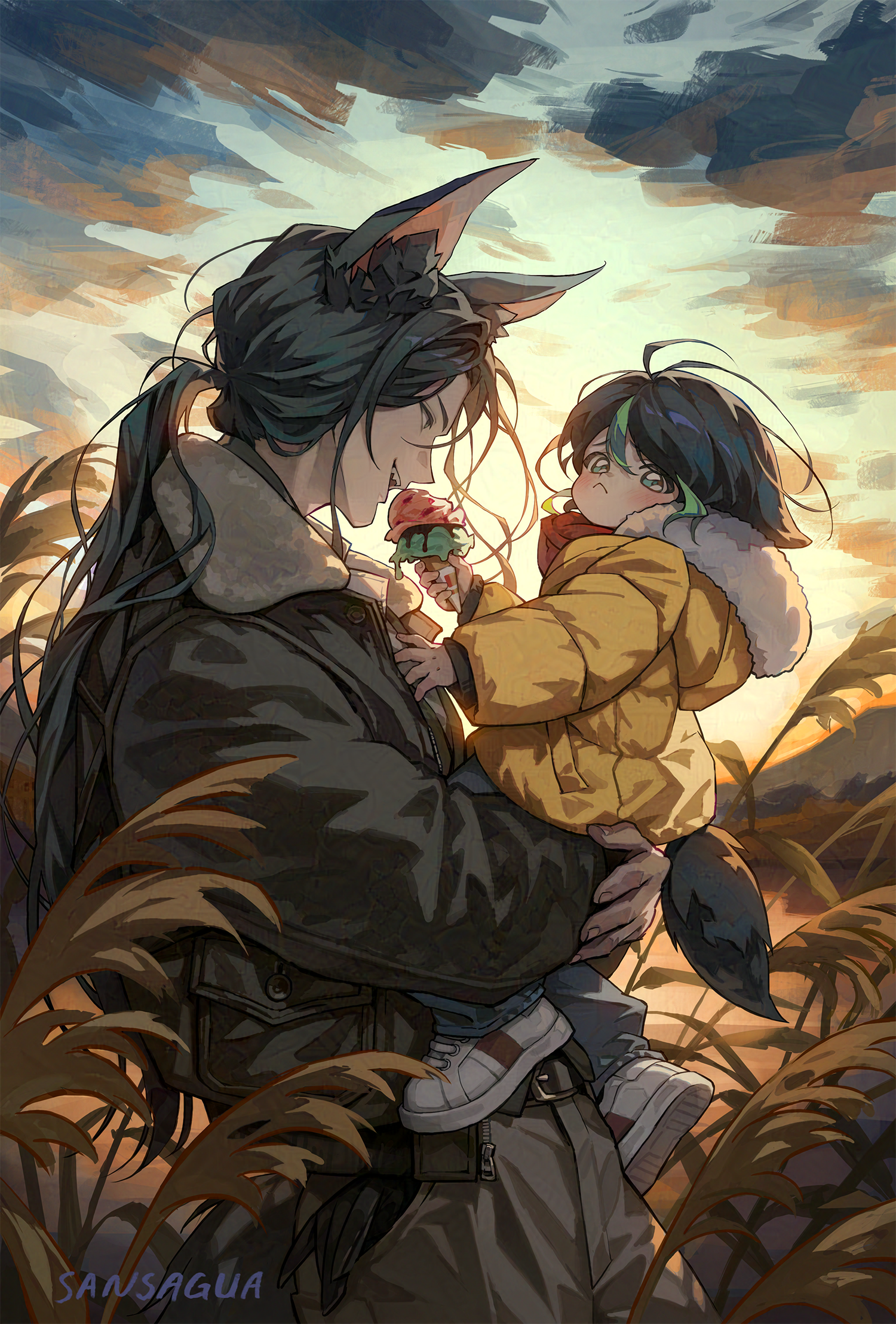 2boys aged_down alternate_costume animal_ear_fluff animal_ears artist_name black_hair black_jacket black_tail blush closed_eyes closed_mouth food fox_boy fox_ears fox_tail frown fur-trimmed_hood fur-trimmed_jacket fur_trim genshin_impact green_eyes green_hair hair_between_eyes highres holding holding_ice_cream_cone hood hooded_jacket hoodie ice_cream ice_cream_cone jacket long_hair long_sleeves male_focus multicolored_hair multiple_boys open_mouth ponytail sansaguaart short_hair smile streaked_hair tail tighnari's_father_(genshin_impact) tighnari_(genshin_impact) yellow_hoodie yellow_jacket