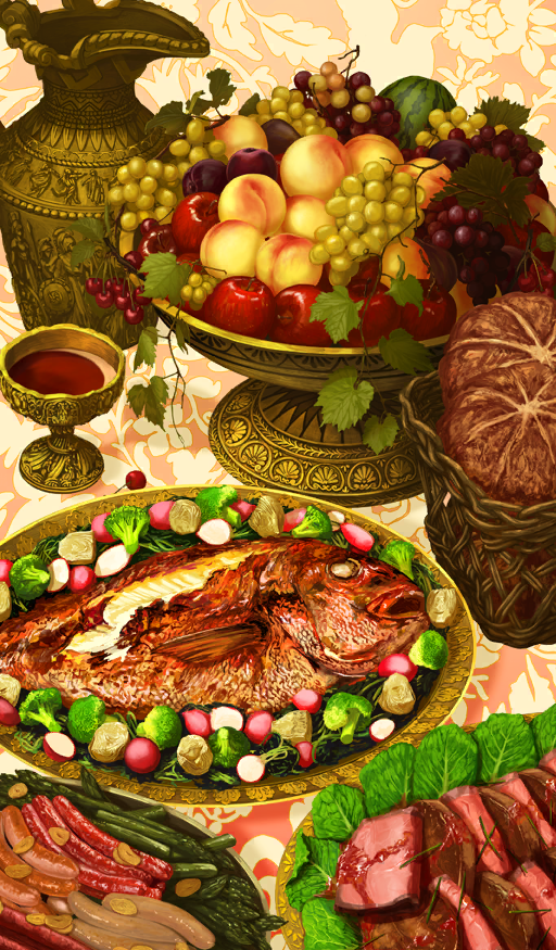 akitaken_(non_faciem) apple bread chalice chocolate_lady_no_karasawagi commentary cup fate/grand_order fate_(series) fish_(food) food food_focus food_request fruit fruit_bowl grapes no_humans official_art orange_background peach pitcher_(container) plate sausage third-party_source wicker_basket