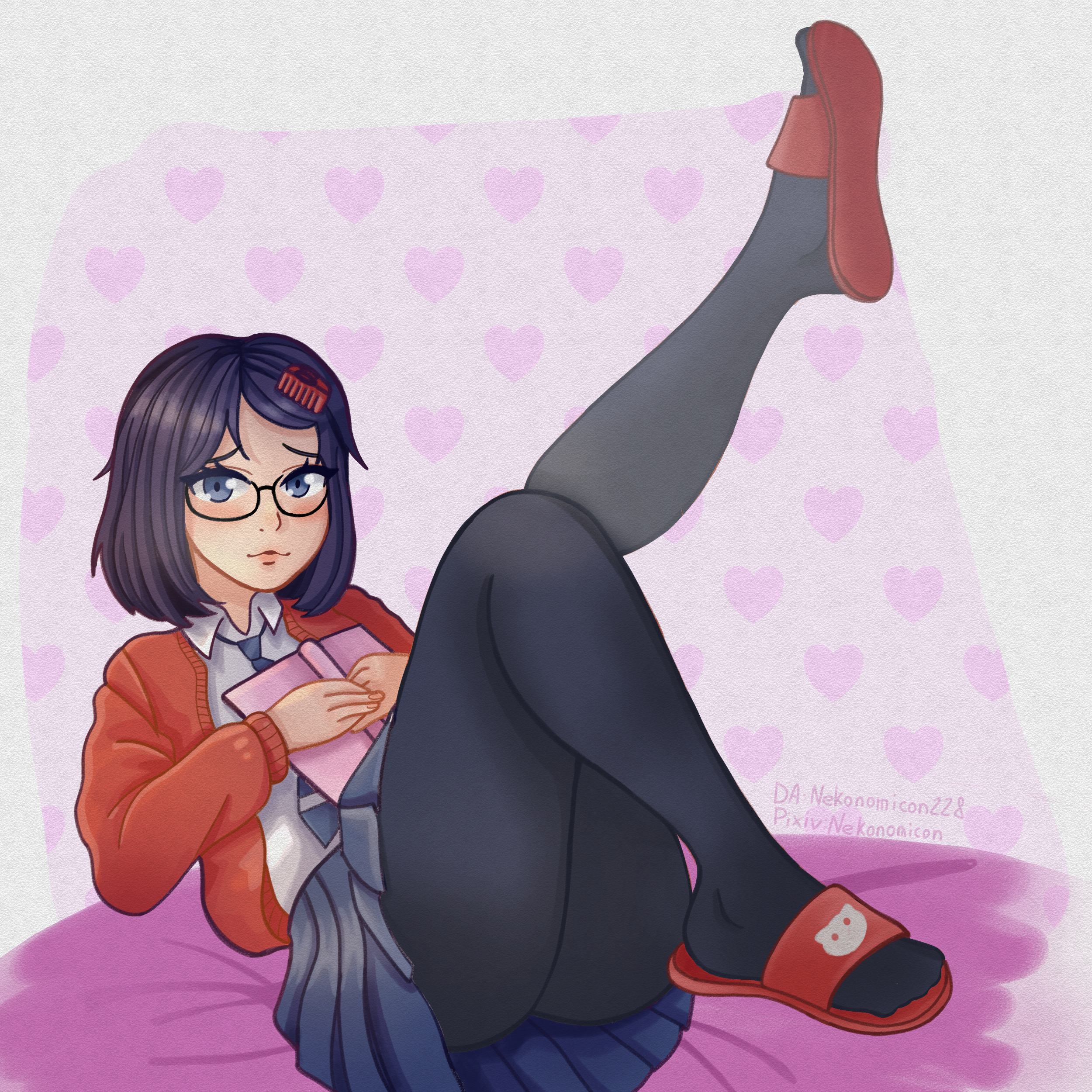 1girl absurdres banette black_hair book feet gen_3_pokemon glasses hair_ornament hairclip highres mila_(miside) miside mita_(miside) necktie nekonomicon pantyhose pokemon short_hair simple_background skirt slippers solo