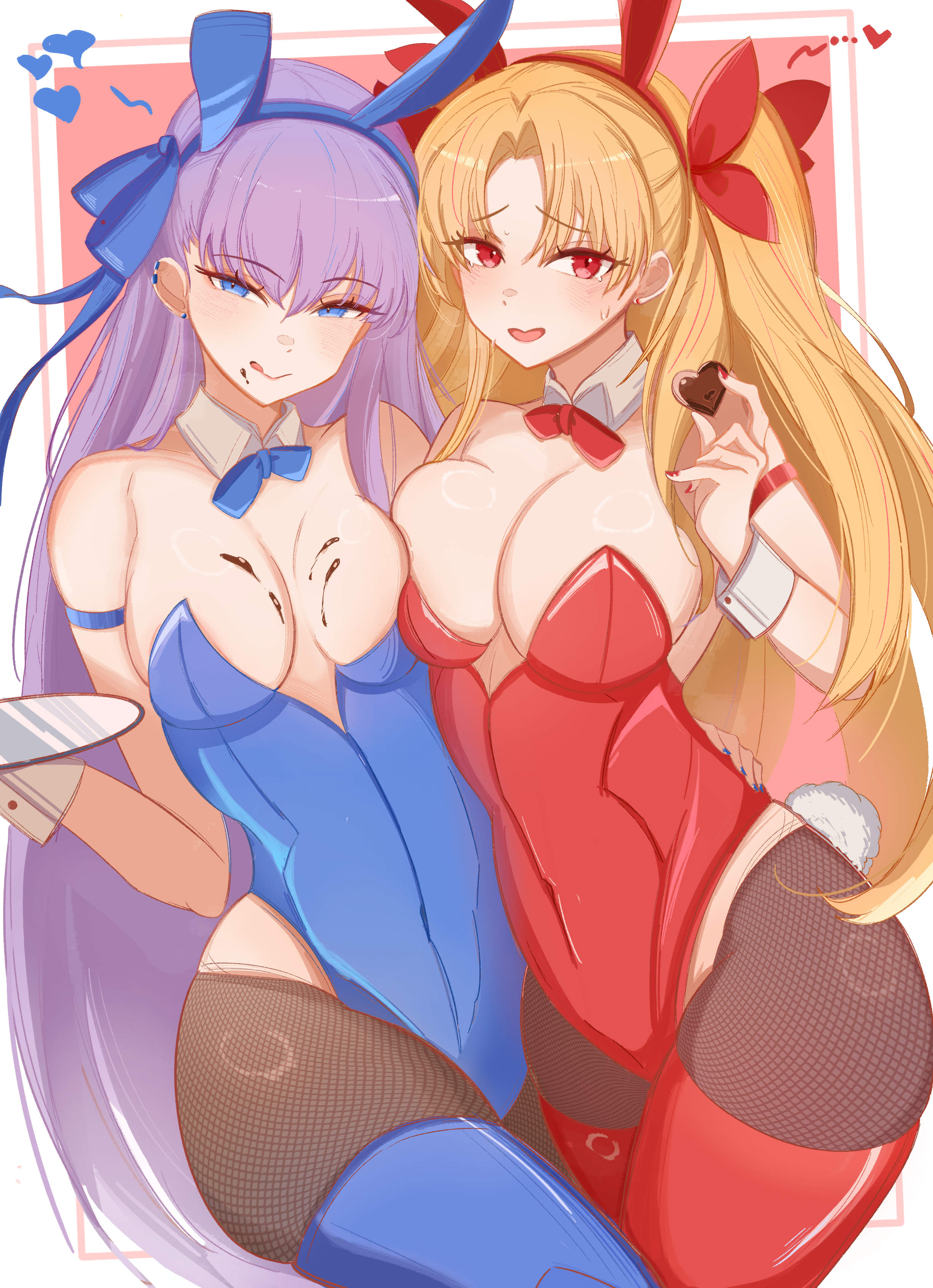 0nineo9 2girls absurdres bare_shoulders blonde_hair blue_eyes blush breasts candy chocolate chocolate_heart chocolate_on_body daicon_bunny_girl dress ereshkigal_(fate) fate/grand_order fate_(series) food food_on_body heart heart-shaped_food highres large_breasts long_hair looking_at_viewer meltryllis_(fate) multiple_girls open_mouth original parted_bangs purple_hair red_eyes thighs valentine's very_long_hair