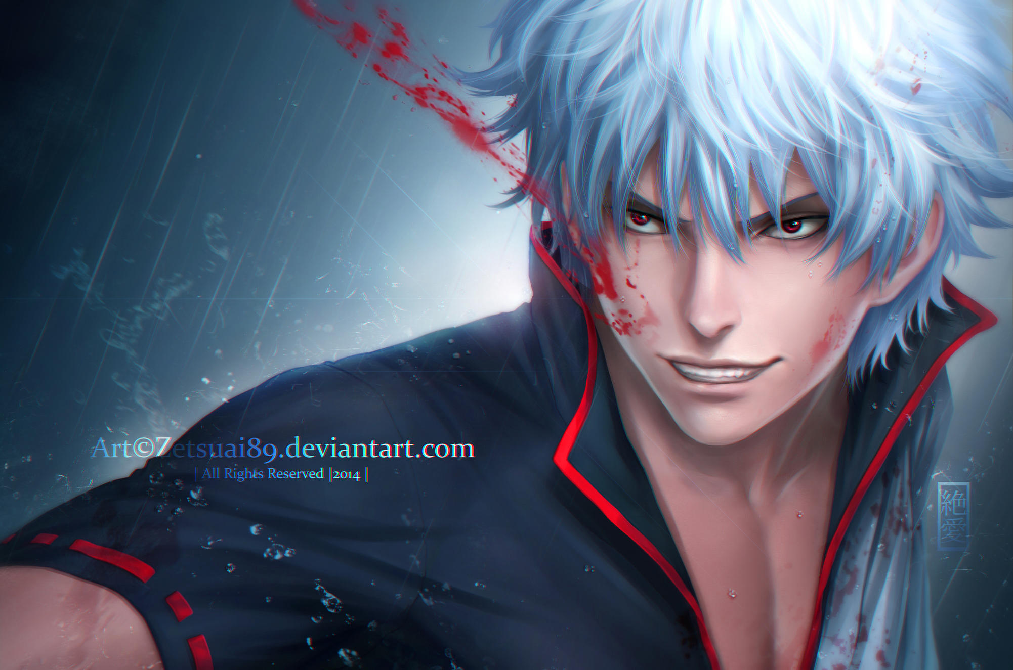 1boy artist_name black_shirt blood breasts cleavage gintama high_collar highres japanese_clothes kimono male_focus rain red_eyes sakata_gintoki shirt short_sleeves smile spotlight teeth upper_body white_hair white_kimono zetsuai89