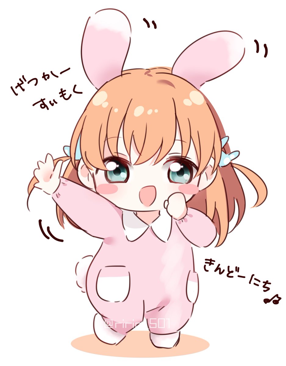 1girl :d animal_ears aqua_eyes arms_up beamed_eighth_notes blush_stickers chibi chibi_only commentary_request crossed_bangs dancing full_body hair_ornament highres hinoshita_kaho holiday_holiday_(love_live!) holiday_holiday_(tenko)_(love_live!) link!_like!_love_live! love_live! lyrics medium_hair musical_note official_alternate_costume onesie open_mouth orange_hair rabbit_ears rabbit_hair_ornament ririn_(ririn_501) simple_background smile solo two_side_up virtual_youtuber white_background