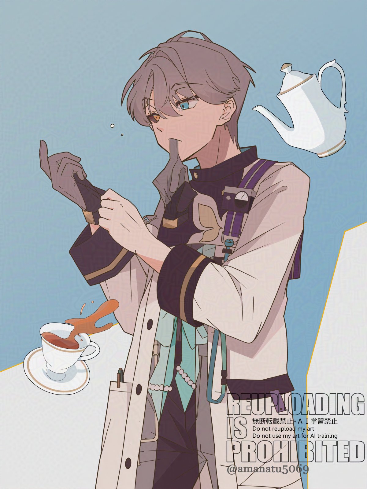 1boy adversarial_noise amanatsu_(amanatu5069) black_sclera black_shorts blue_background blue_eyes coat colored_sclera cup glove_in_mouth gloves grey_gloves grey_hair hands_up heterochromia highres id_card looking_at_hand male_focus mismatched_sclera mouth_hold putting_on_gloves reverse:1999 saucer short_hair shorts single_glove solo spill teacup teapot unworn_gloves upper_body watermark white_background white_coat x_(reverse:1999) yellow_eyes