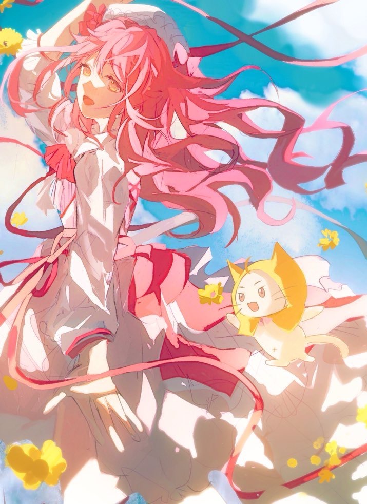 1girl ahoge animal ascot beret berubetto blue_sky bow bowtie brown_eyes cat chinese_commentary cloak clothed_animal cloud commentary_request cowboy_shot cross-laced_clothes cross-laced_dress dress ear_covers eyelashes floating_clothes floating_hair flower frilled_dress frills hair_bow hat hood hood_up hooded_cloak infinity_nikki long_hair long_sleeves looking_ahead medium_dress momo_(nikki) navel nikki_(nikki) nikki_(series) open_mouth orange_eyes petals pink_ascot pink_bow pink_hair pink_ribbon pink_skirt ribbon showgirl_skirt skirt sky smile standing two_side_up very_long_hair waist_bow waist_ribbon wavy_hair whiskers white_cat white_dress white_hat wind yellow_cloak yellow_flower