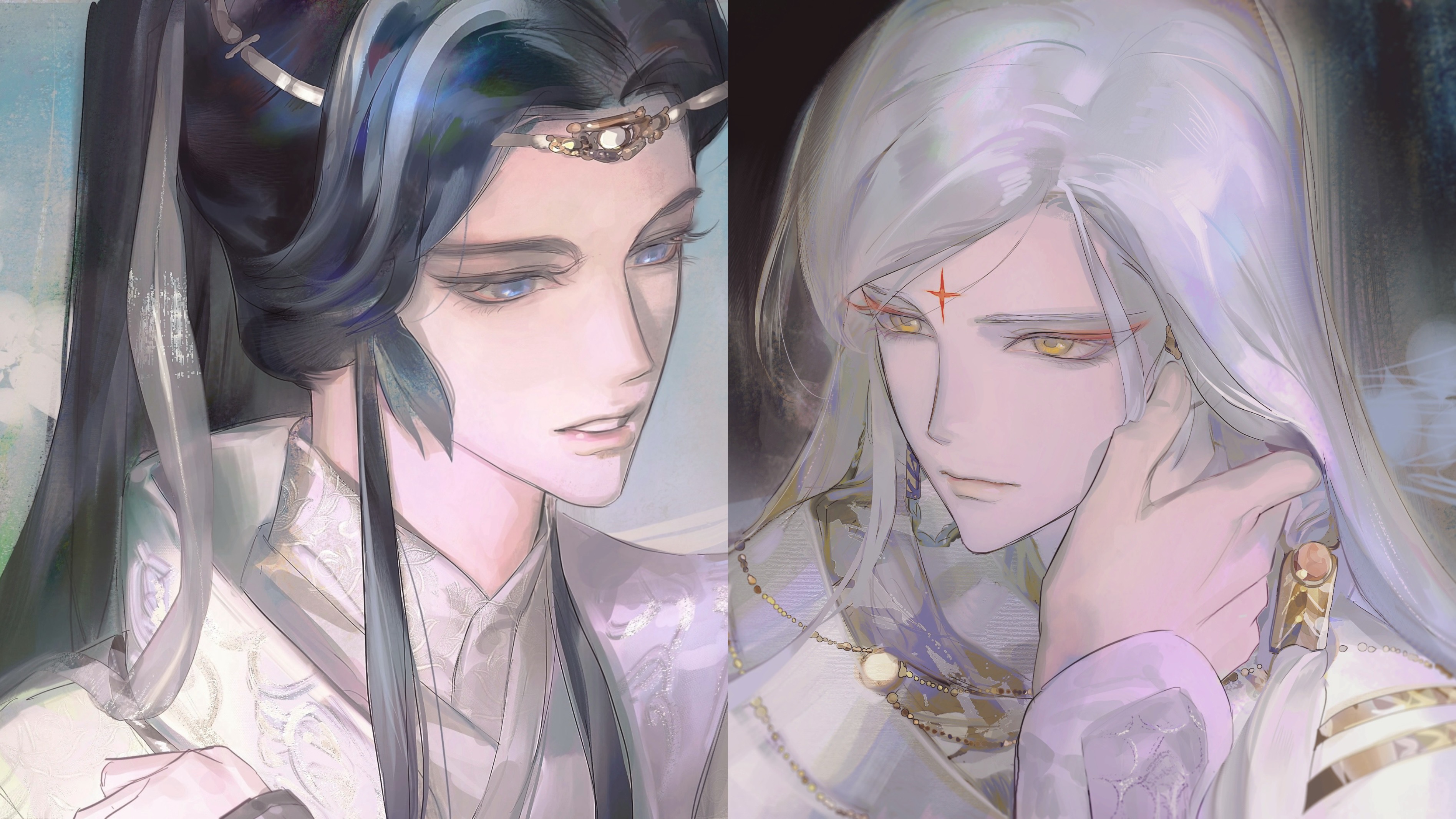 2boys absurdres black_hair blue_eyes blue_hair chinese_clothes circlet closed_mouth facial_mark hair_pulled_back hand_on_another's_cheek hand_on_another's_face hanfu highres huadian jinguang_budaixi long_hair long_sidelocks long_sleeves looking_at_another male_focus moranhuishouquandoushigou multicolored_hair multiple_boys parted_bangs parted_lips ponytail portrait qiao_rulai shi_yanwen side_part sidelocks streaked_hair teeth white_hair white_hanfu white_sleeves yaoi yellow_eyes
