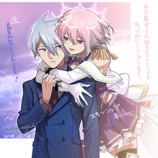 1boy 1girl aki_(neyuki41028) anti_(ssss.gridman) bare_shoulders blue_jacket brown_eyes cowboy_shot dated gloves grey_hair gridman_universe gridman_universe_(movie) hug hug_from_behind jacket pink_hair purple_shirt purple_skirt shinjou_akane_(new_order) shirt signature skirt ssss.dynazenon twitter_username white_gloves