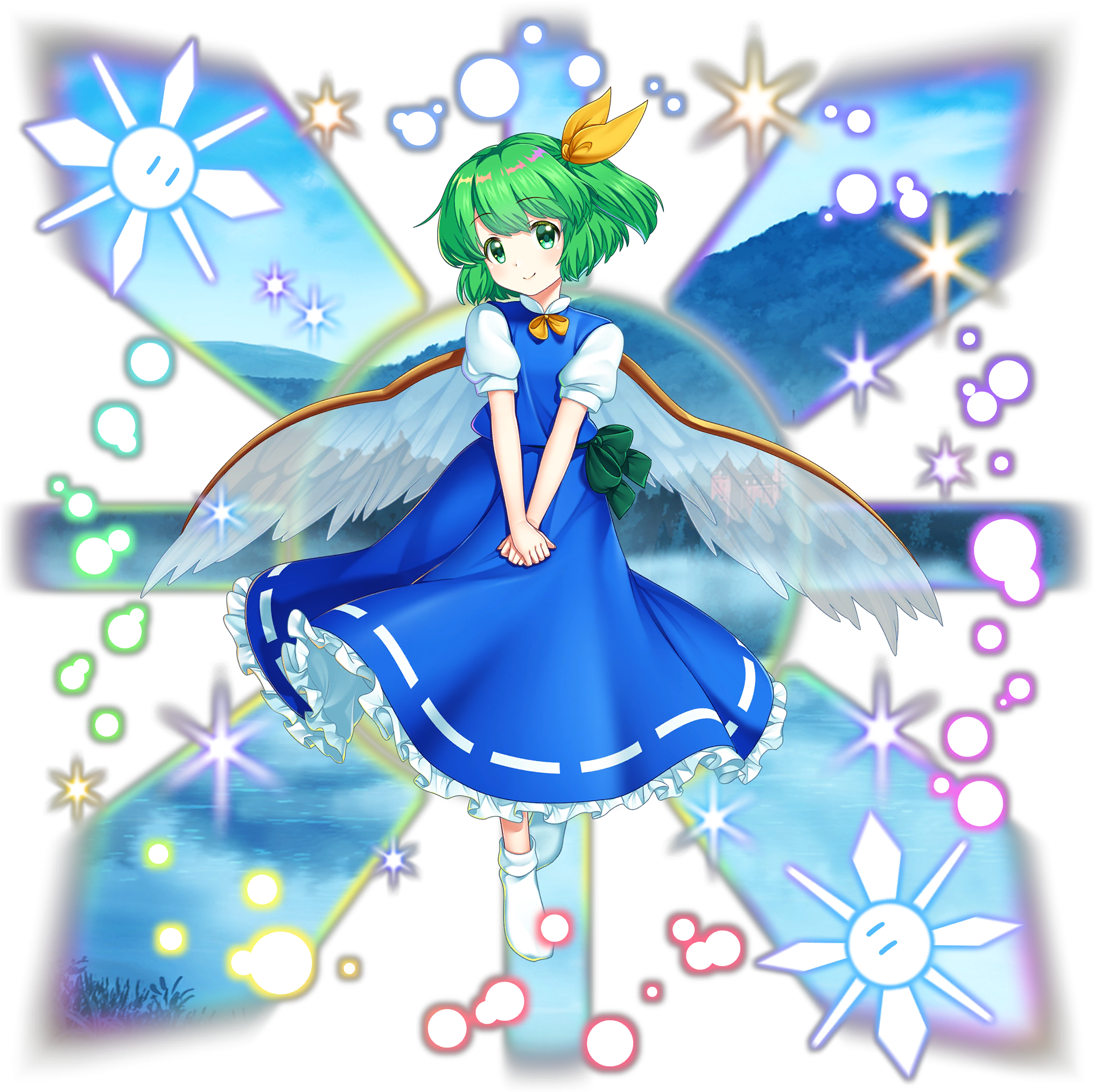 1girl alternate_costume blue_skirt blue_vest closed_mouth daiyousei daiyousei_(scarlet) embodiment_of_scarlet_devil fairy_wings full_body game_cg green_eyes green_hair hair_ribbon highres looking_at_viewer official_art one_side_up own_hands_together puffy_short_sleeves puffy_sleeves ribbon ribbon-trimmed_skirt ribbon_trim rotte_(1109) shirt short_hair short_sleeves skirt smile socks solo third-party_source touhou touhou_lostword transparent_background v_arms vest white_shirt white_socks white_wings wings yellow_ribbon