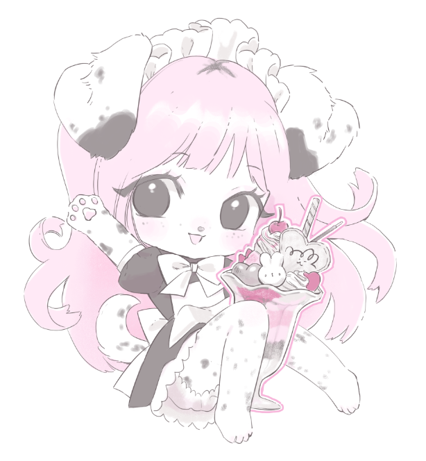 1girl animal_ears animal_feet animal_hands black_dress bow cherry chibi chibi_only commentary cup dalmatian dog_ears dog_girl dog_tail dress english_commentary food fruit furry furry_female long_hair looking_at_viewer open_mouth original parfait pawpads pink_hair simple_background sketch solo spotted_fur tail vampire_valentine very_long_hair white_background white_bow white_fur
