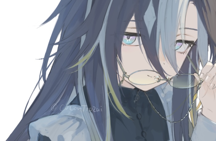 1girl black_hair blue_eyes brown_hair closed_mouth cocontoozai dream_journey_(umamusume) eyewear_strap glasses hair_between_eyes holding holding_removed_eyewear horse_girl long_sleeves looking_at_viewer multicolored_hair simple_background smile solo umamusume unworn_eyewear white_background white_hair