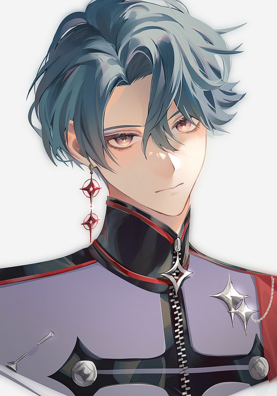1boy blue_hair closed_mouth collared_jacket commentary curtained_hair earrings freodore_(nijisanji) hair_between_eyes hashtag-only_commentary high_collar highres jacket jewelry male_focus miii_ii_i multicolored_eyes nijisanji nijisanji_en parted_hair piercing portrait simple_background single_earring solo virtual_youtuber white_background zipper zipper_pull_tab