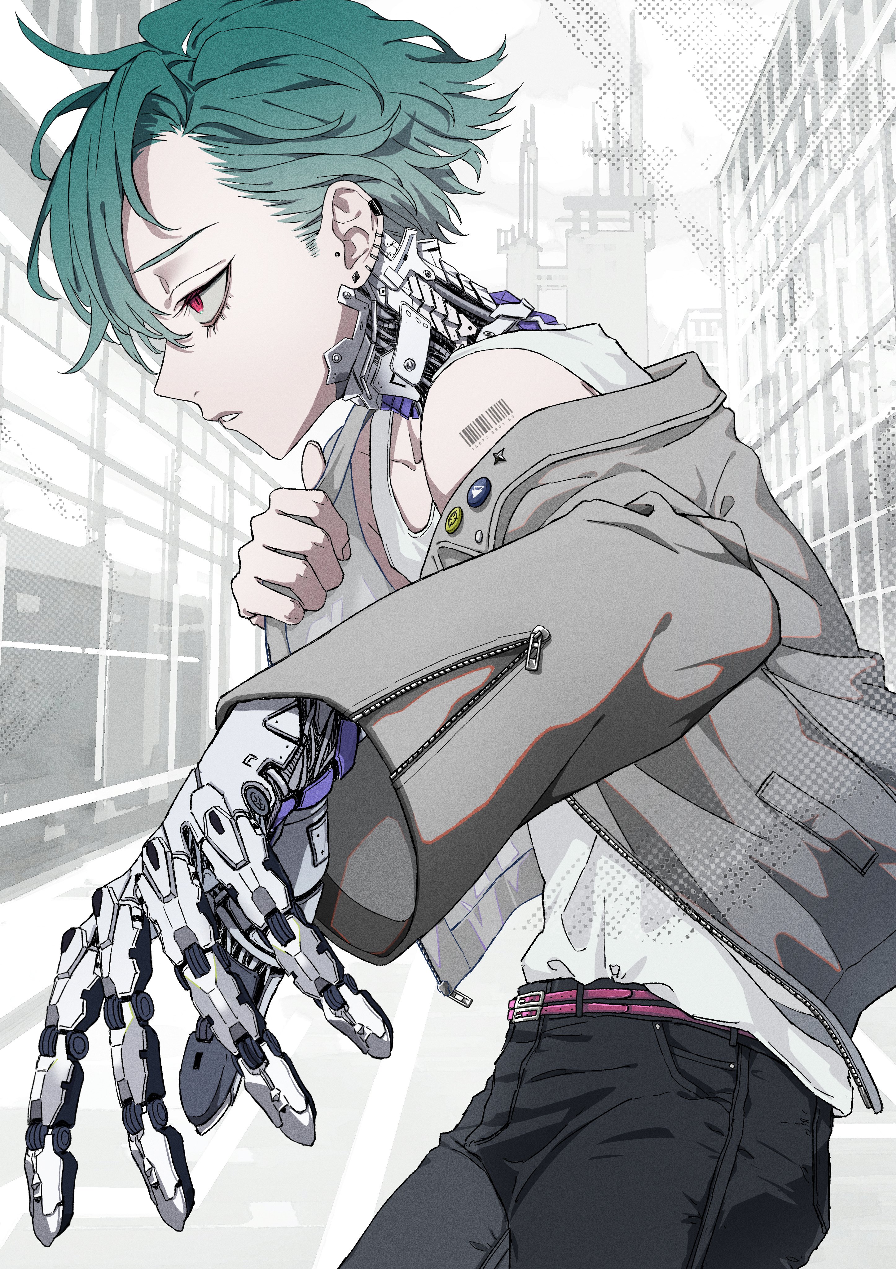 absurdres android barcode belt black_pants building eyelashes from_side green_hair grey_jacket highres jacket open_clothes open_jacket original pants pink_belt red_eyes shirt short_hair solo white_shirt xxx_akc zipper