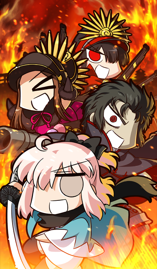 >_< 1boy 3girls :d ahoge aqua_haori black_capelet black_gloves black_hair black_hat black_jacket black_scarf black_thighhighs bow brown_hair cape capelet chacha_(fate) chibi chibi_only commentary fate/grand_order fate_(series) fiery_background fire gloves grey_eyes gudaguda_meiji_ishin gun hair_over_one_eye half_updo haori hat hijikata_toshizou_(fate) holding holding_gun holding_sword holding_weapon jacket japanese_clothes katana keikenchi kimono long_hair looking_at_viewer multiple_girls oda_nobunaga_(fate) oda_nobunaga_(koha-ace) official_art okita_souji_(fate) okita_souji_(koha-ace) okita_souji_(third_ascension)_(fate) open_mouth orange_background peaked_cap pink_bow pink_hair red_cape red_eyes ringed_eyes scarf shinsengumi short_hair short_kimono sidelocks smile sword thighhighs third-party_source v-shaped_eyebrows weapon weapon_request white_kimono