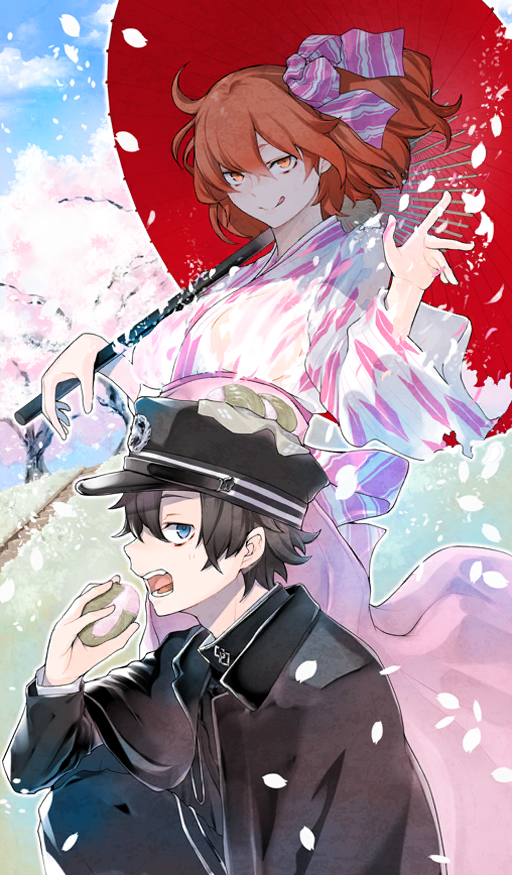 1boy 1girl ahoge black_hair black_hat black_jacket black_pants black_shirt blue_eyes blue_sky bow cherry_blossoms cherry_tree closed_mouth cloud commentary day fate/grand_order fate_(series) feet_out_of_frame food from_side fujimaru_ritsuka_(female) fujimaru_ritsuka_(female)_(walking_in_the_spring_breeze) fujimaru_ritsuka_(male) fujimaru_ritsuka_(male)_(walking_in_the_spring_breeze) grass gudaguda_meiji_ishin hair_between_eyes hair_bow hat high_collar holding holding_food holding_umbrella jacket japanese_clothes kimono long_sleeves looking_at_viewer looking_to_the_side medium_hair mochi official_art oil-paper_umbrella one_side_up open_mouth orange_eyes orange_hair outdoors pants peaked_cap pink_bow pink_kimono red_umbrella sakura_mochi shirt short_hair sitting sky stairs standing sunlight teeth third-party_source tongue tongue_out two-tone_bow two-tone_kimono umbrella umbrella_over_shoulder wagashi white_kimono wide_sleeves wind yasuda_suzuhito
